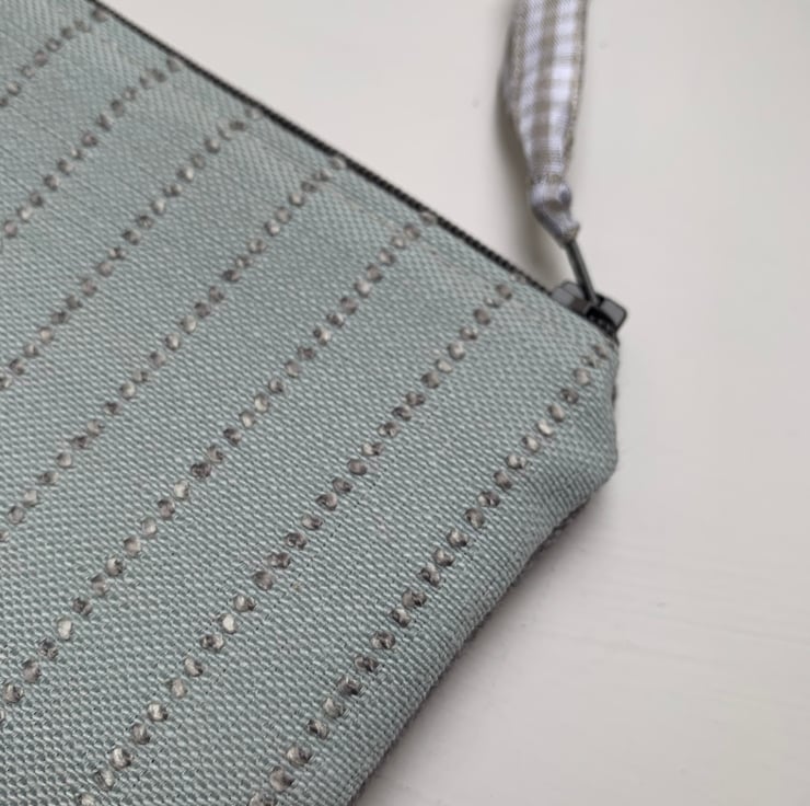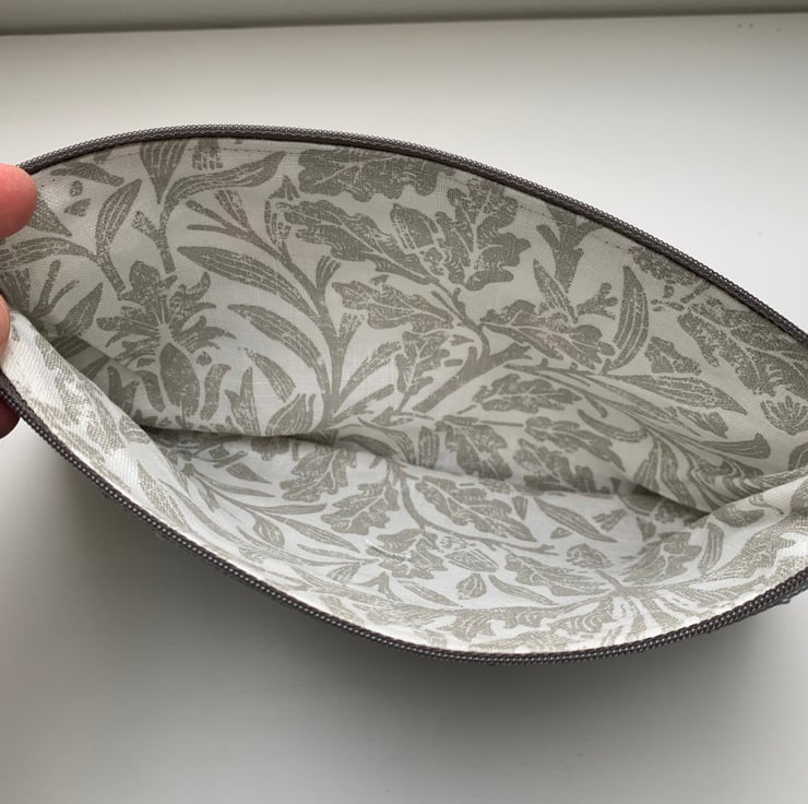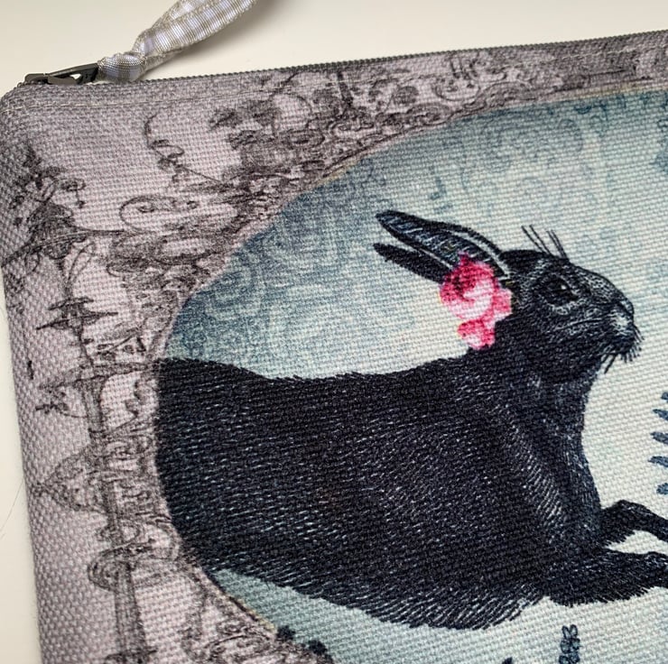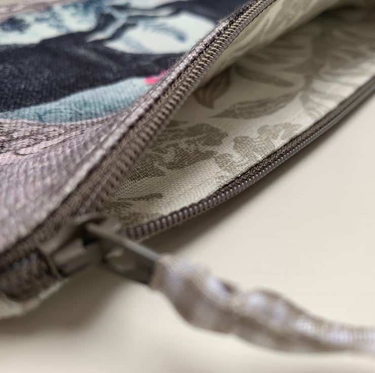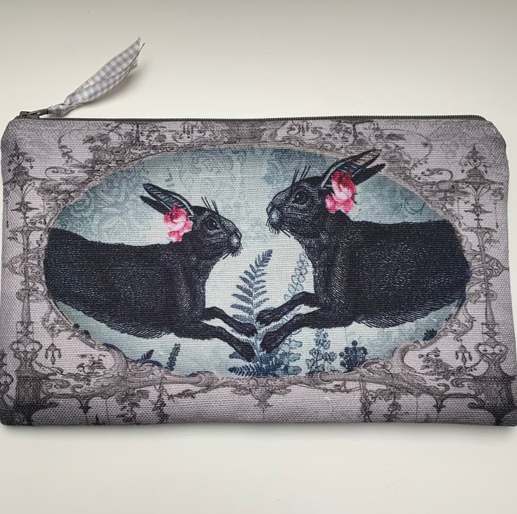 Hare print linen zip pouch in soft shades of blue, grey and purple. It’s backed with a woven blue/grey fabric with a raised chenille pinstripe and fully lined in William Morris acorn linen.