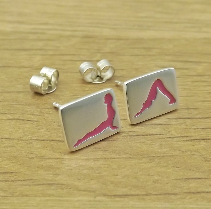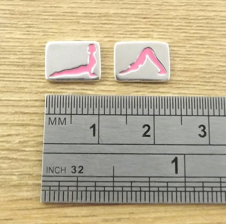 These stud earrings feature images of yoga positions and have been lovingly handcrafted in the UK. They are made from sterling silver sheet and are etched before being cut by hand, the edges are then smoothed using files and emery paper before the 11mm ear pins are then soldered onto the back. A coloured resin based enamel is added to the etched areas and then the earrings are polished.