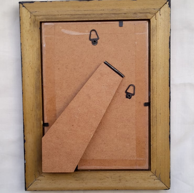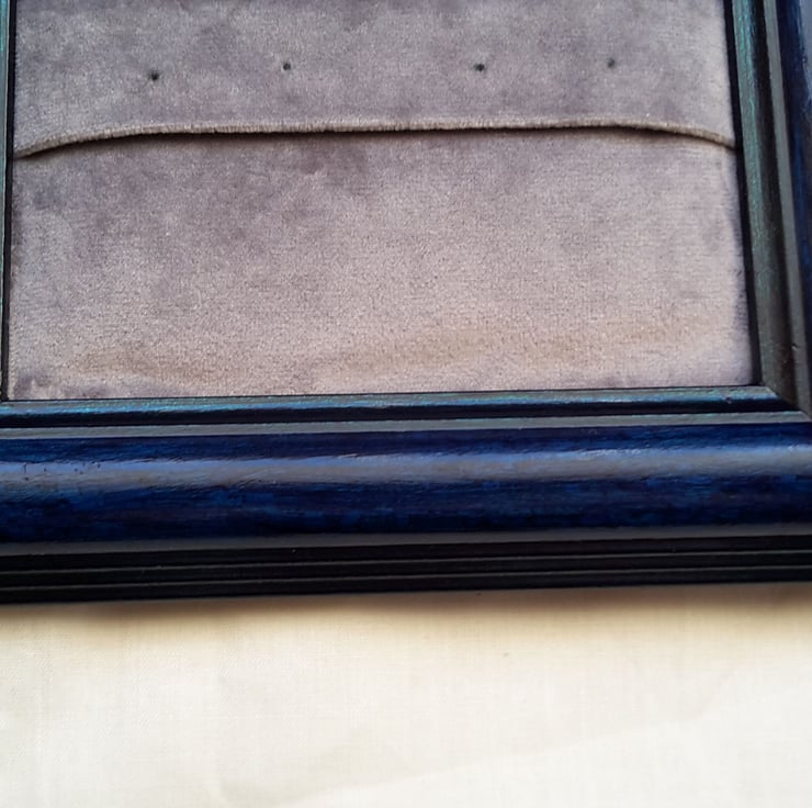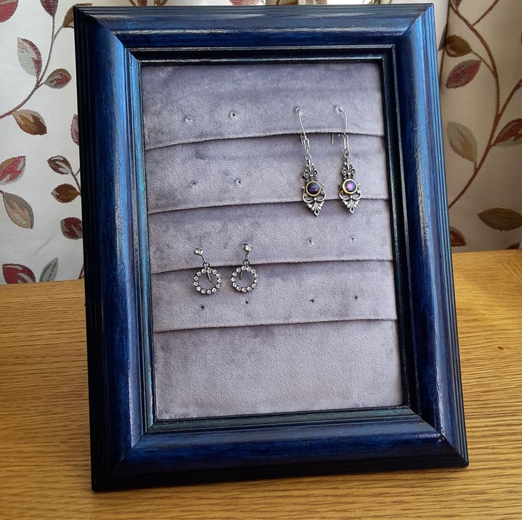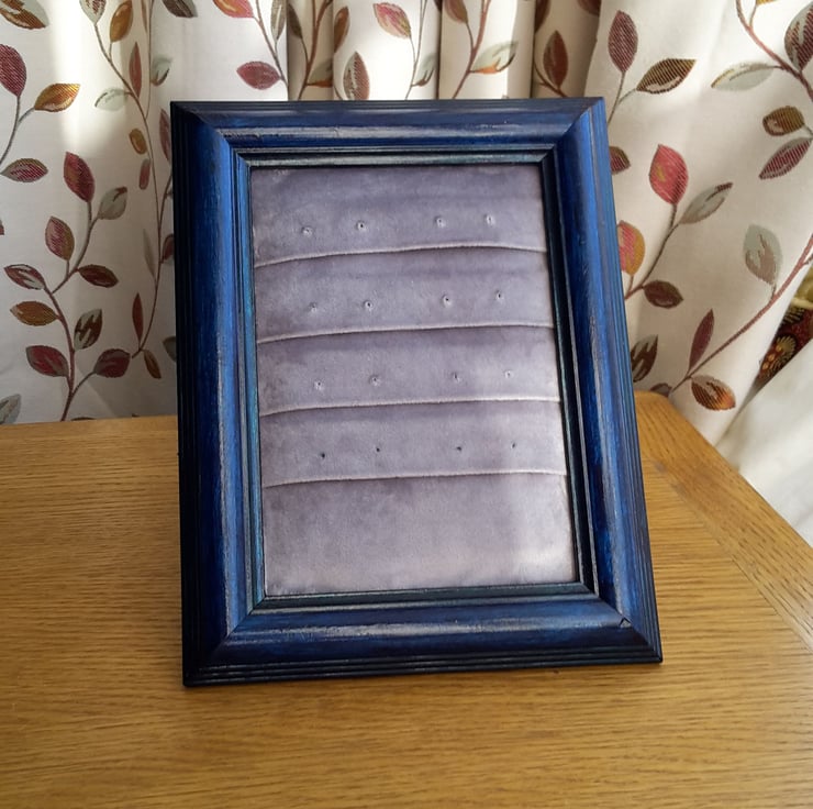 Once a frame for a 7” by 5” (18cm x 13cm) photo or picture, now a holder for eight pairs of earrings. It's free-standing, but it could also be hung on a wall.
