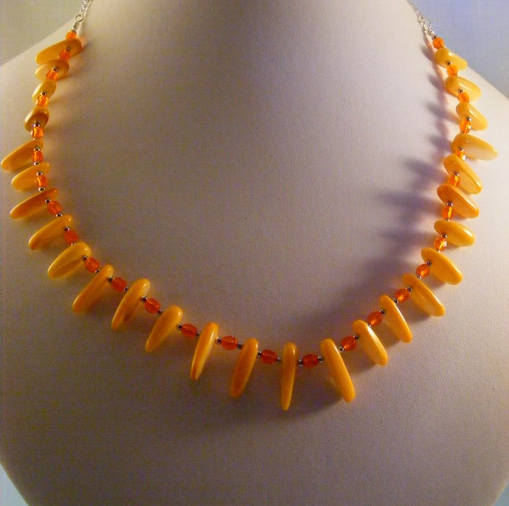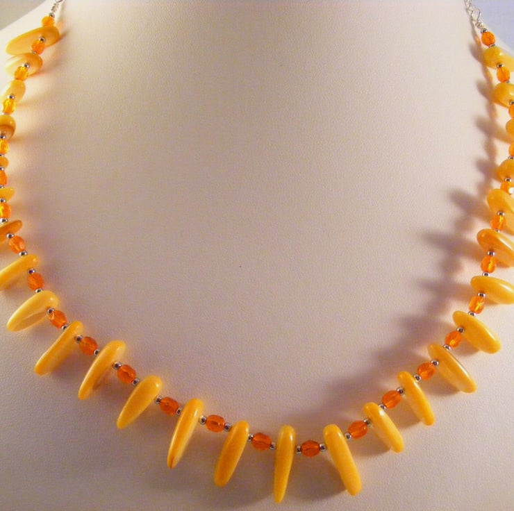 Handmade, one of a kind necklace made with, orange shell nuggets, 4 mm orange Czech fire polish beads, 2 mm silver plated spacers, silver plated wire, fine oval link chain, lobster clasp and jump rings. Fire polish, shell nuggets and spacers are all threaded onto silver plated wire.