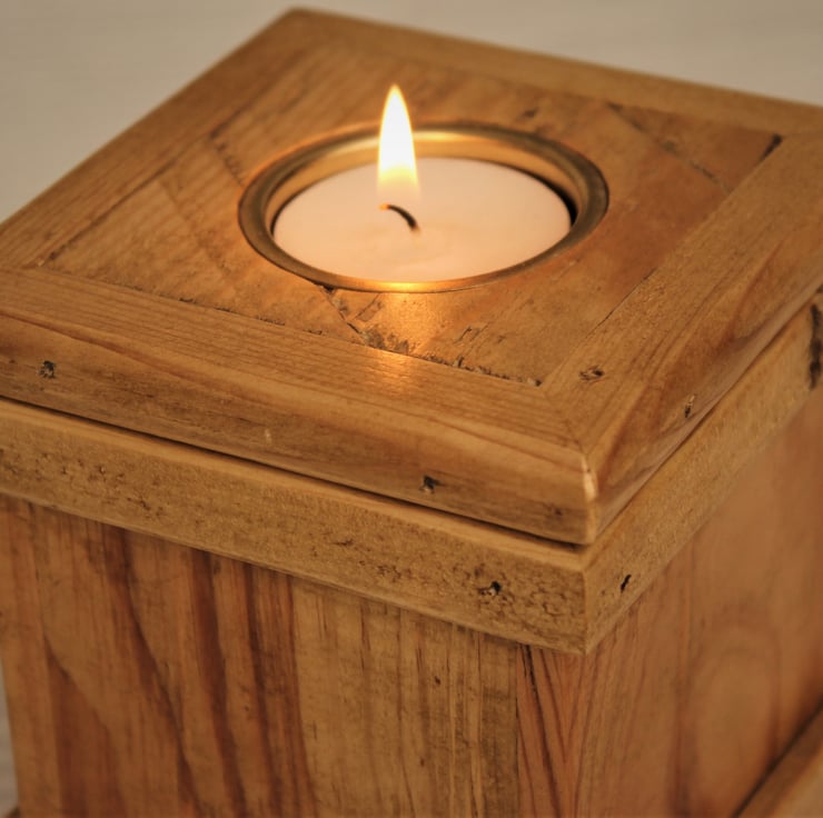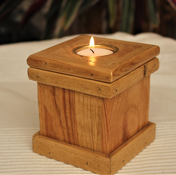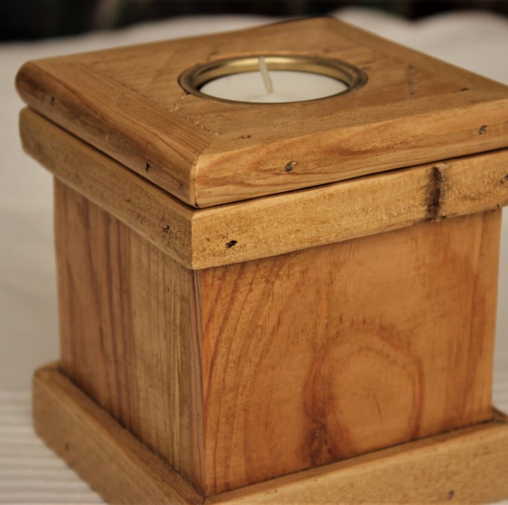 As rough as you like pine wooden rustic tealight box cut, glued and pined together and has a tealight holder set into the lid. The box is waxed in such a way that it makes the box look antique.