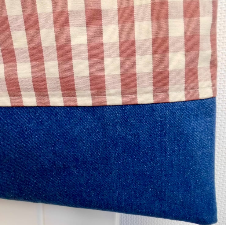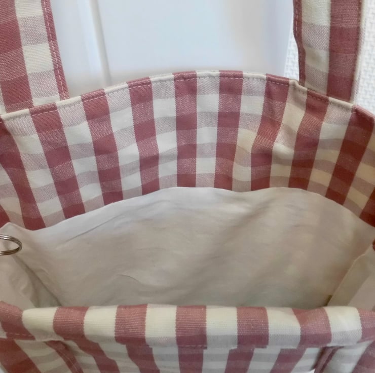 I have made this long handled tote bag in a furnishing weight gingham in pink and cream. Lower half of the bag is indigo denim. Inside, it is faced at the top with the gingham for a professional finish and then lined with a plain cream lining cotton. I have inserted a key ring into one of the side seams, useful for clipping keys or purse safely inside your bag.