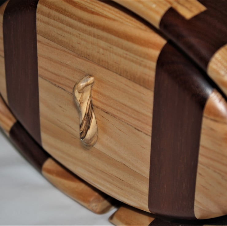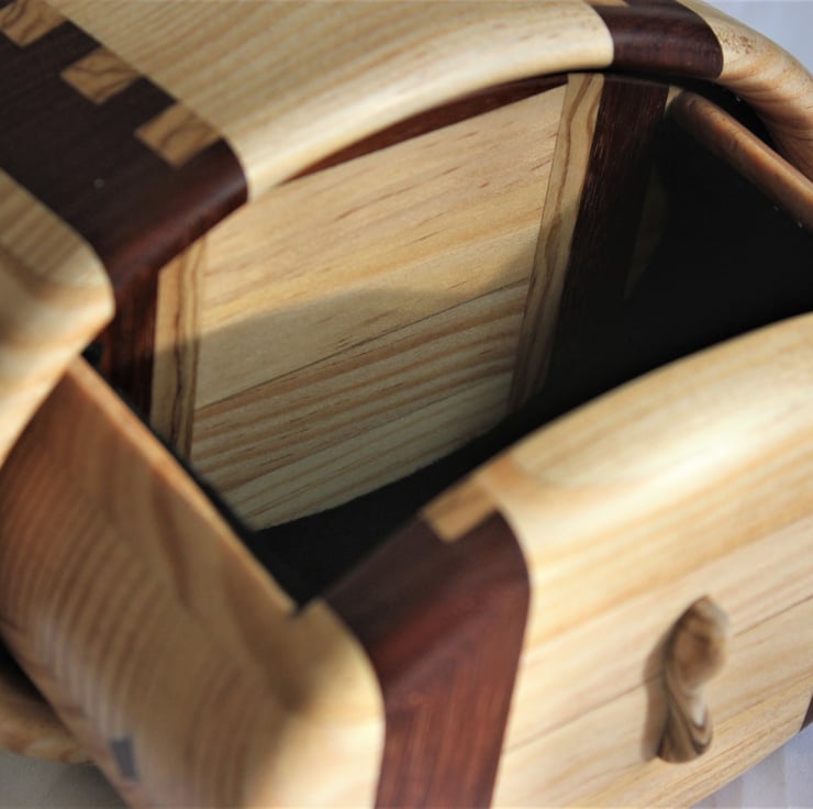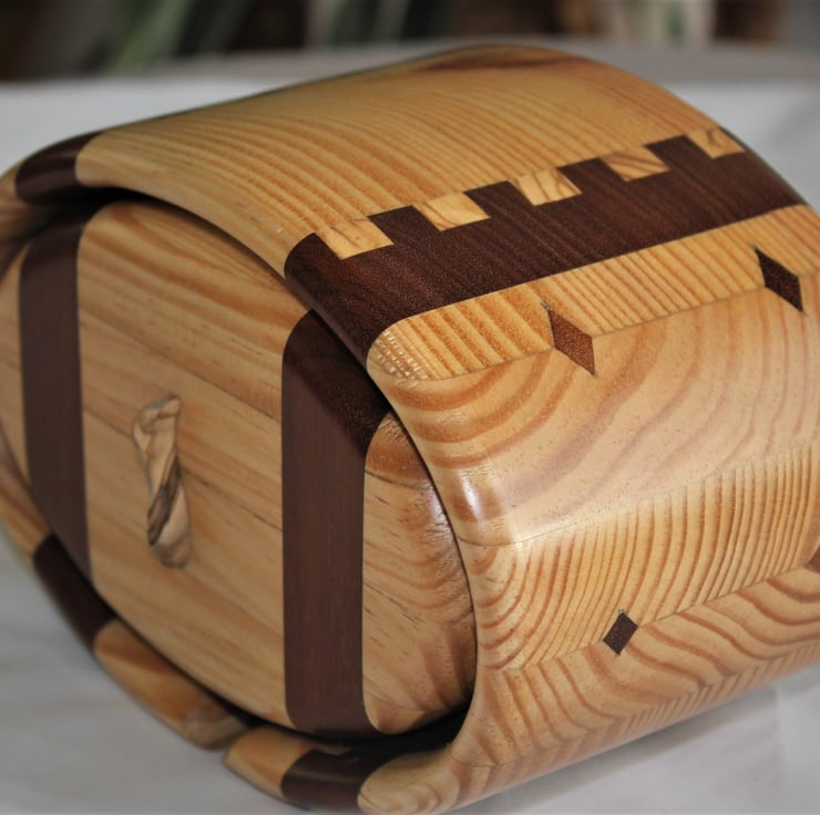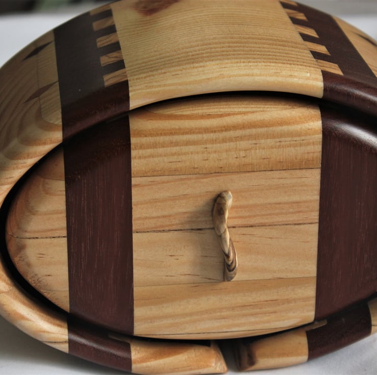 This beautiful oval shaped wooden box has been laminated in a special way to incorporate diamond shapes within the timber. This is a Bandsaw box, but with a difference as to how the wood is made up and laminated as you can see in the pictures.
