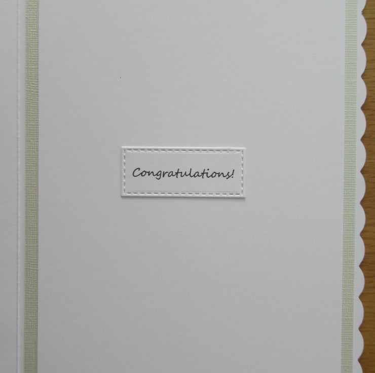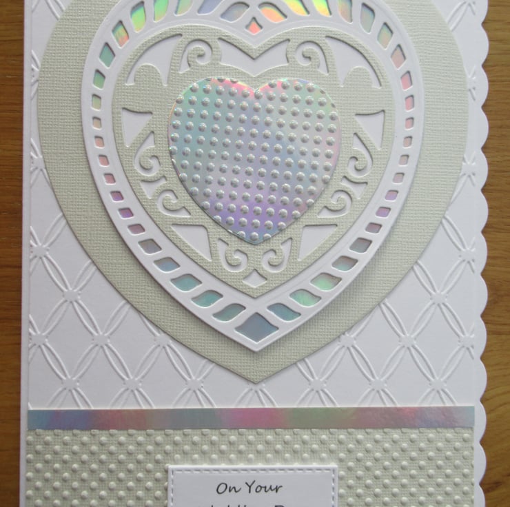 It features a large multi layered heart in beige, white and silver rainbow mirror card. The top layered heart and the white background have both been embossed for added texture and luxury and the card is finished with an On Your Wedding Day greeting placed below the heart . The inside has been finished to coordinate with a congratulations message.