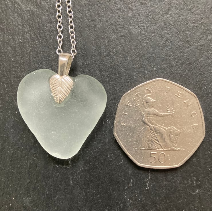 The seaglass has been washed and rinsed with a small amount of baby oil to clear the salt deposit, but is unchanged in shape. The heart measures approx 3cm across and just under 3cm top to bottom, see photo against a 50p piece.