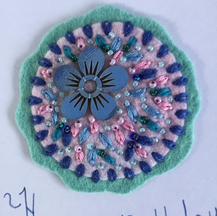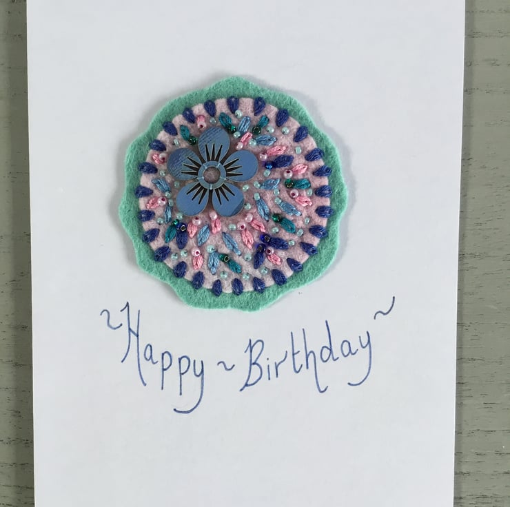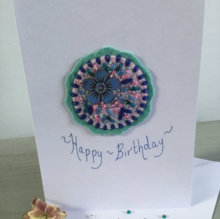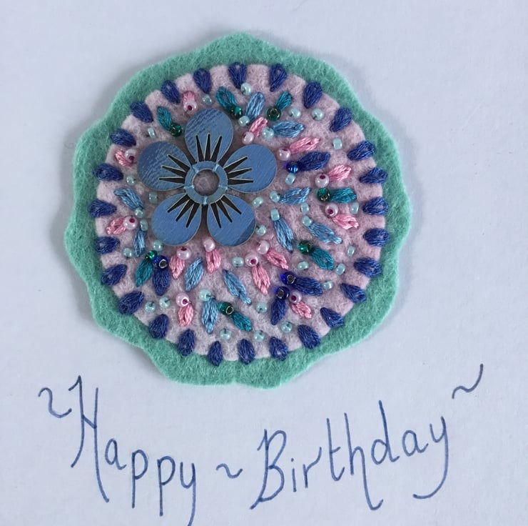 A small wooden blue flower motif is stitched onto circles of pale pink and blue felt, on this Embroidered Blue Flower Birthday Card. Lazy-Daisy Stitches with small seed beads in blue and pink threads are hand embroidered around this blue flower. This pretty embroidery sits on complimentary lavender coloured card.