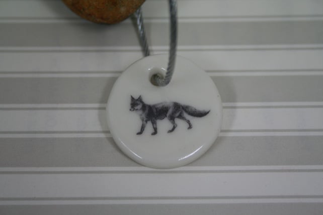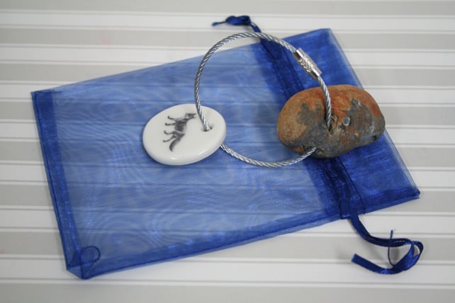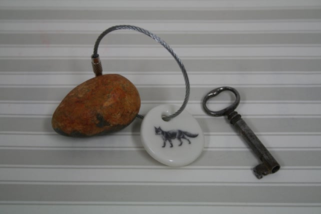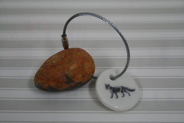 The pebble keyrings are all completely individual as they include a found beach pebble with a hole in. The porcelain disc is made by me and measures about 3.5cm wide. This one features a fox image. It is not glazed on the reverse. Altogether it makes a charming ensemble. The wire loop which screws into itself measures 15cm long when undone and about 5cm diameter when screwed together. Supplied in a pretty organza bag.