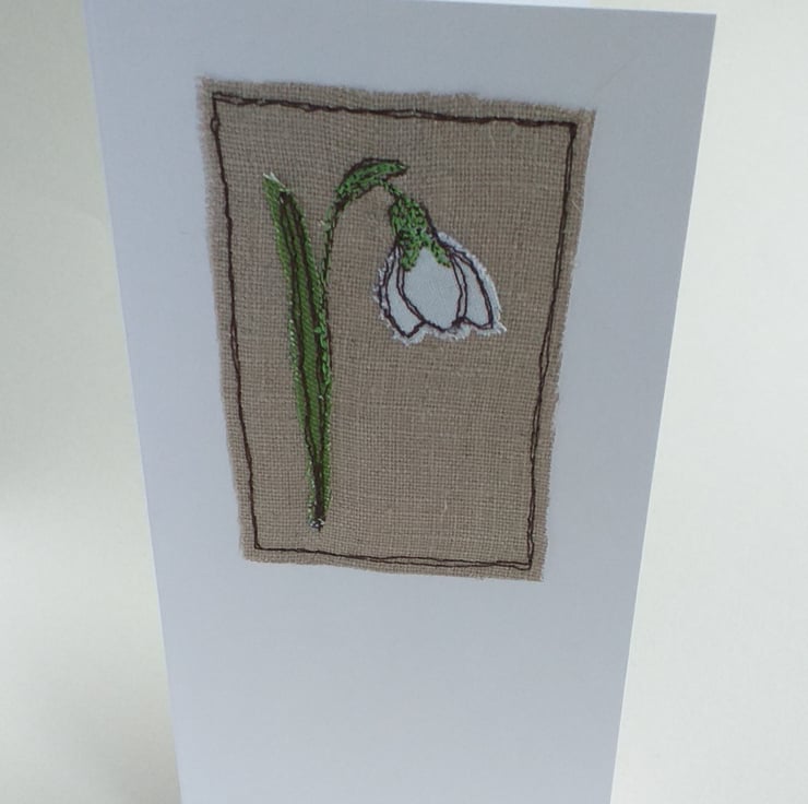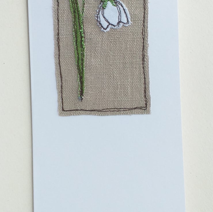 This is a white card with a snowdrop design. The flower is made using appliqued fabric scraps, which are individually cut out by hand and embroidered onto beige linen using freestyle machine embroidery.