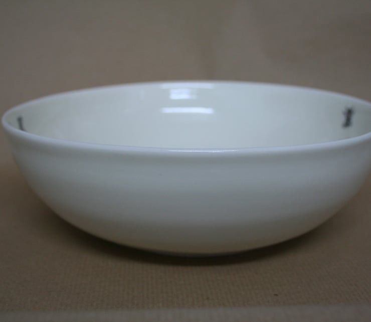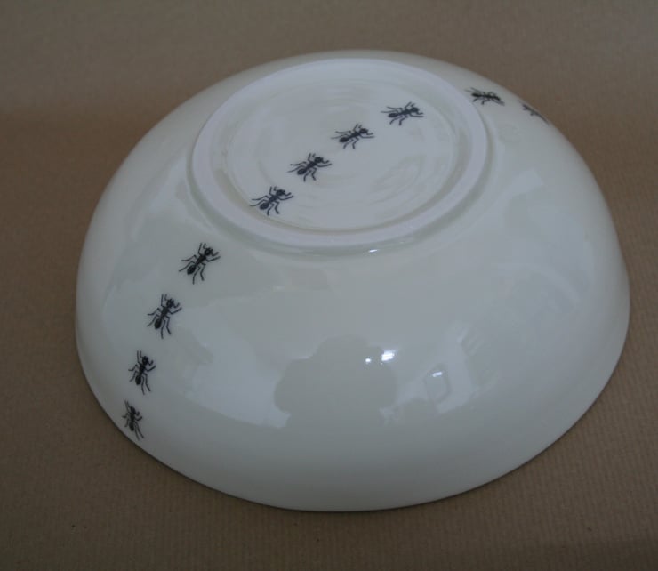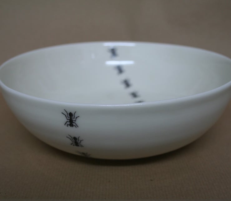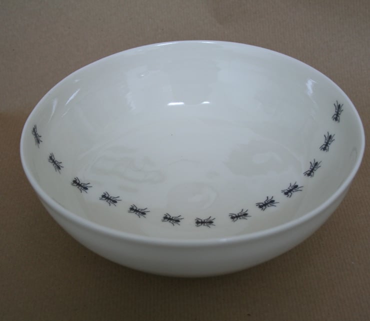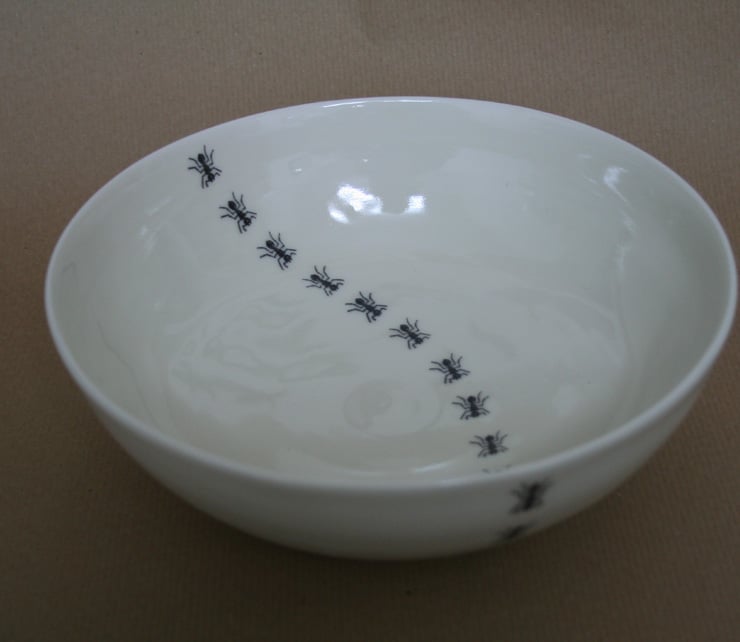 A larger porcelain bowl, hand thrown on the potter’s wheel with a hand turned base. Decorated with ant motifs forming a trail all around the bowl. There are 25 ants measuring about 1.5cm each. The bowl measures approximately 21cm diameter at the rim and 7cm high. The ant transfers are fired on at 800 degrees centigrade which is a third firing. The item is fully dishwasher, microwave, and oven safe. Or it can be just used as a fruit bowl for example!