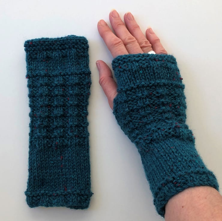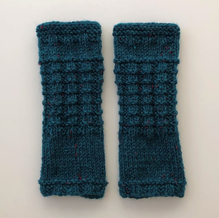 These dark teal blue tweed soft fingerless mittens / wrist warmers / gloves are knitted with a pretty waffle pattern. They are made from 25% Aran tweed wool with little flecks of red and teal green and are 8 inches long.