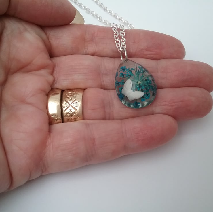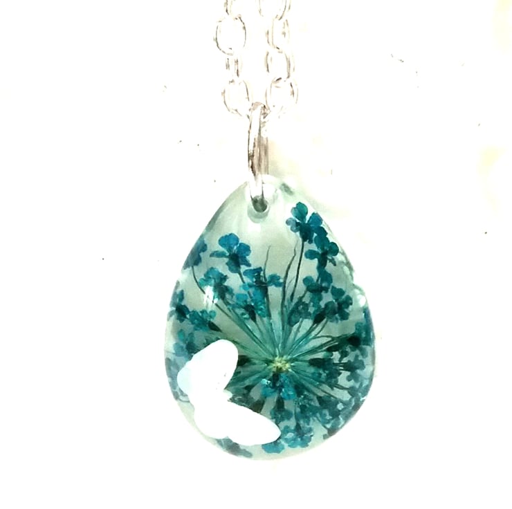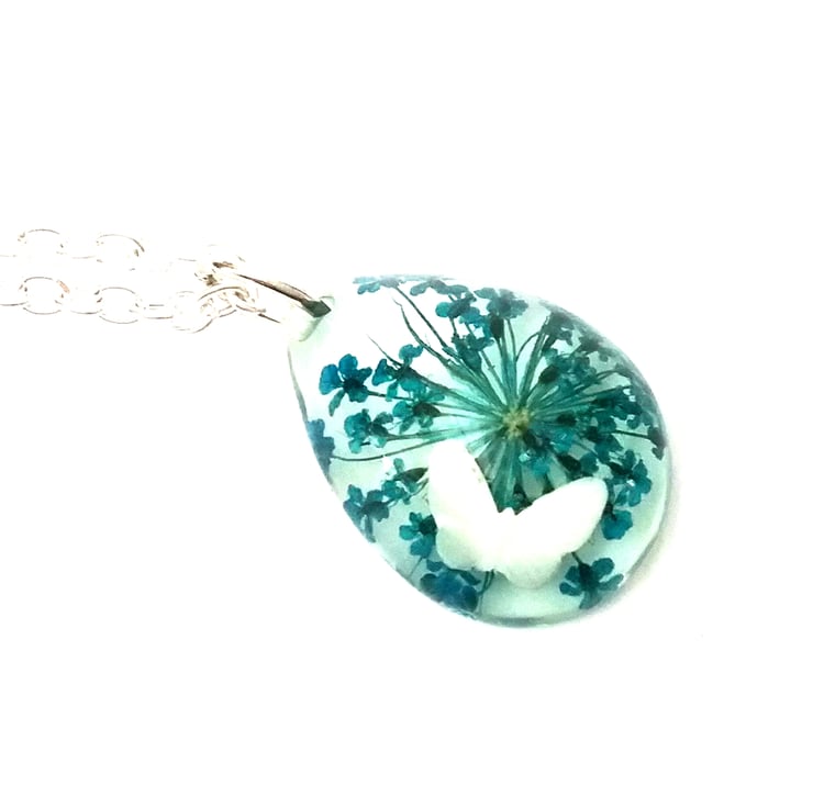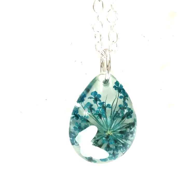 Delicate real blue flower & butterfly resin teardrop necklaces