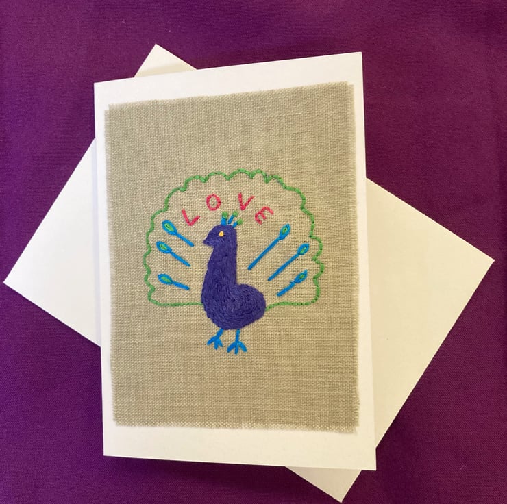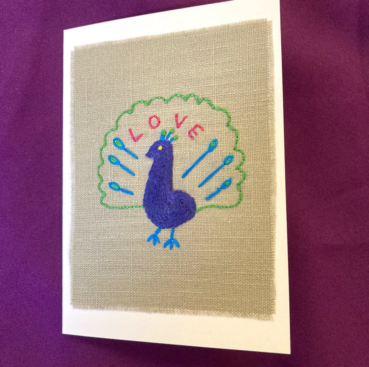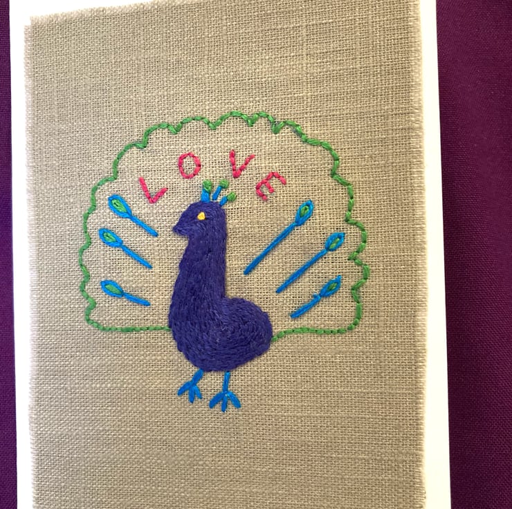 A splendid hand embroidered peacock with the message 'Love'. The peacock has been embroidered onto linen and mounted on a white greetings card. The inside of the card has been left blank for your own message. The card would be a lovely Valentine's Day card, but could also be for any occasion. Card size 10.5cm x 15cm (4" x 6").