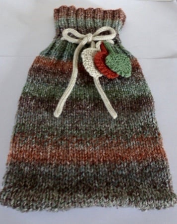 A hand knitted hot water bottle cover in a 100% acrylic self patterning yarn in browns and greens. It measures approximately 9" wide by 10.5" to the neck of the bottle - total length is 15.5". It has three knitted leaves in green, copper and parchment and a parchment cord. It should fit a standard size bottle so just place it inside and pull the cord tight around the neck. Lovely to snuggle up to and the bottle should stay warmer for longer.