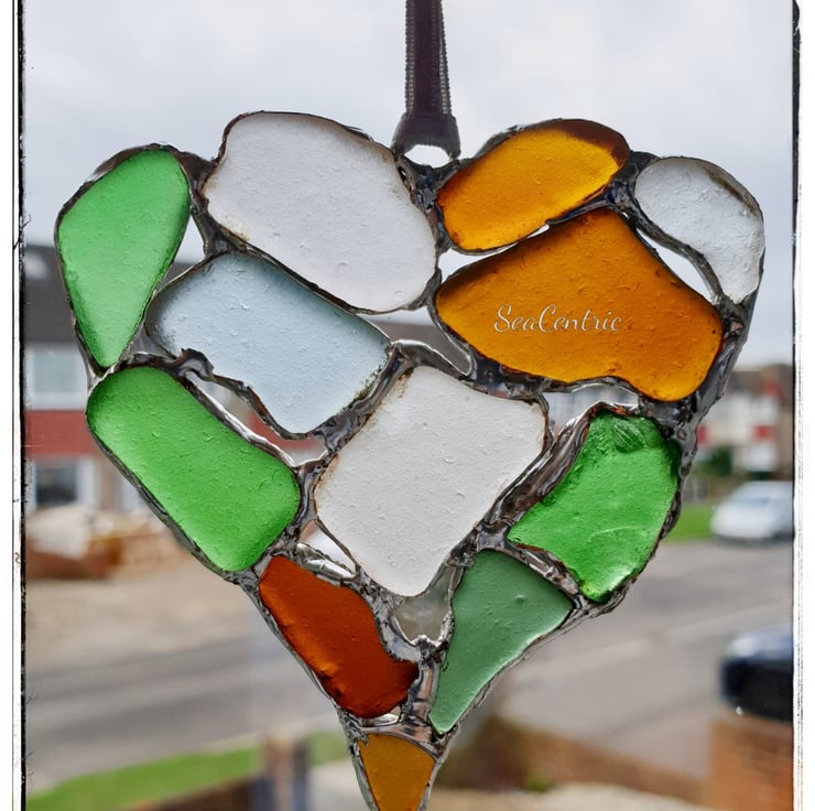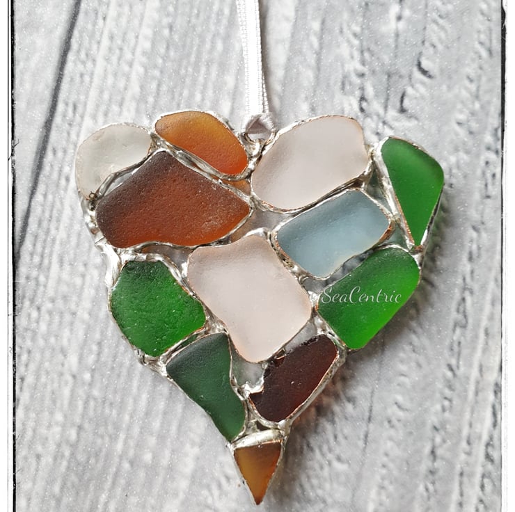 A cute little suncatcher created with multiple seaglass that are soldered together to create a mosaic heart. This suncatcher measures appropriately 7cm vertically.