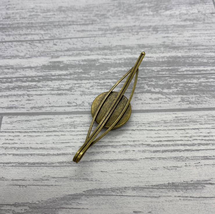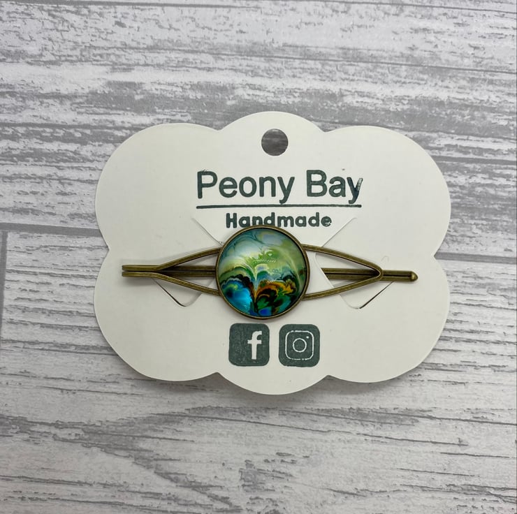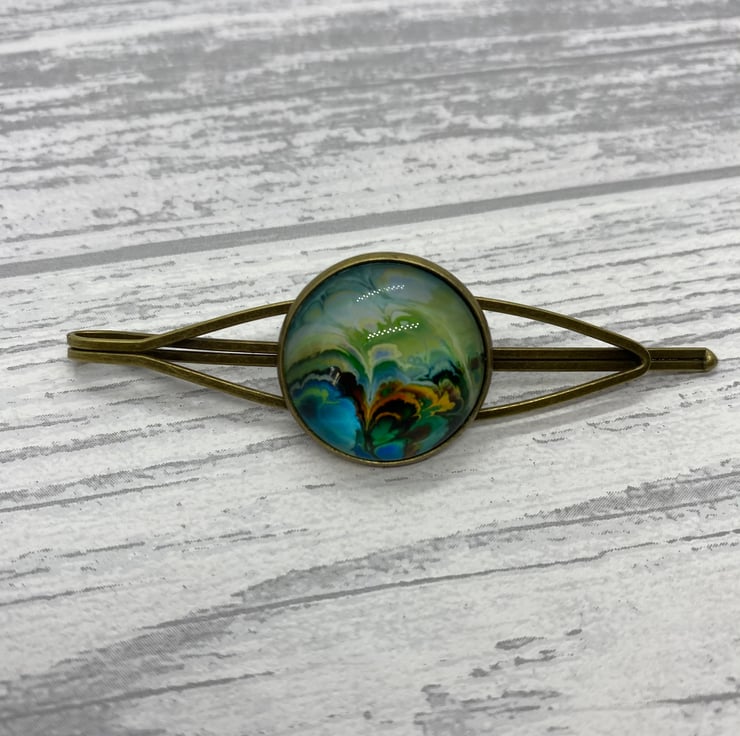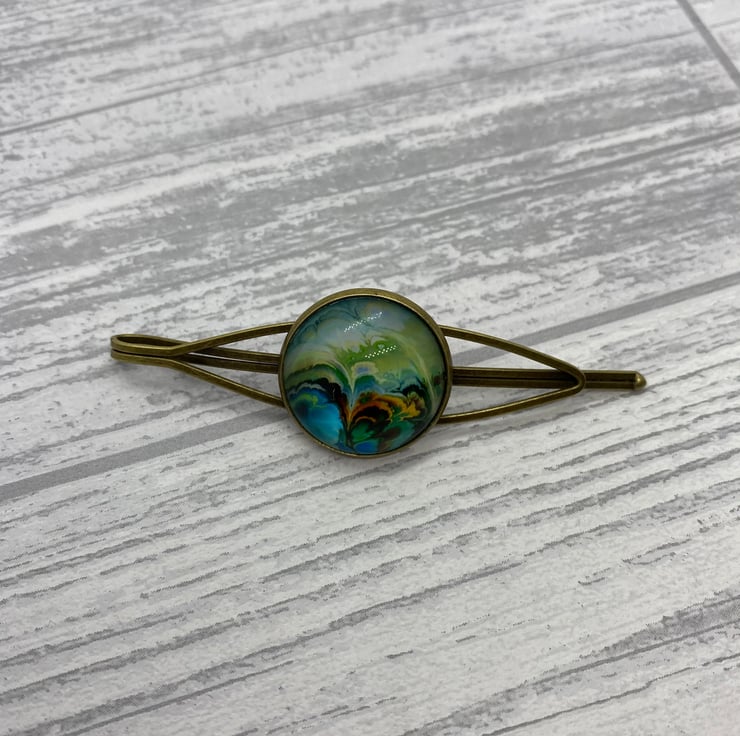 This is a beautiful hair clip / hair slide with an abstract print sealed under a glass dome, and set on a bronze tone clip. The colour of the print is predominantly green, and there are shades of blue, orange and brown.