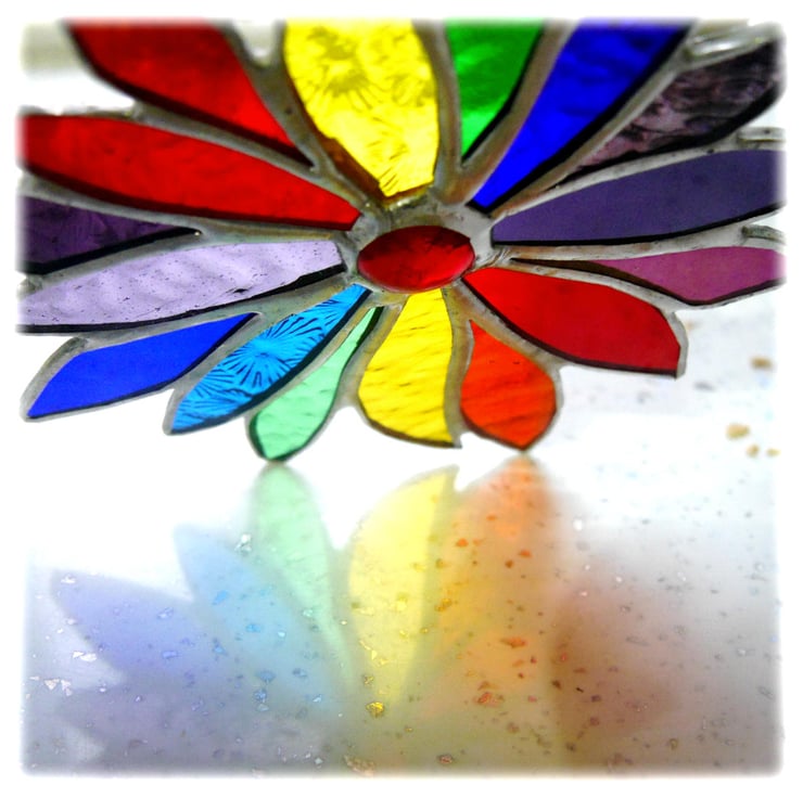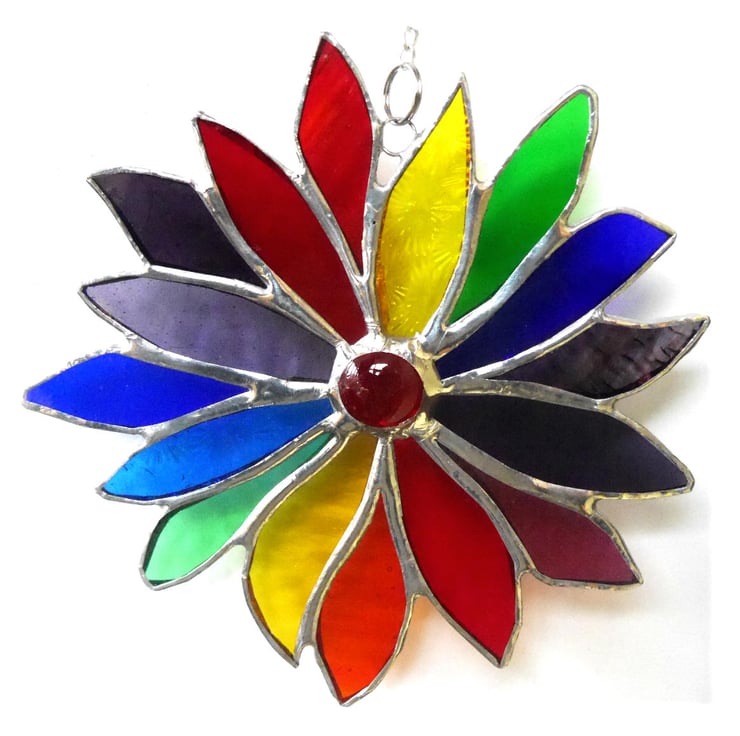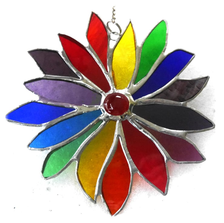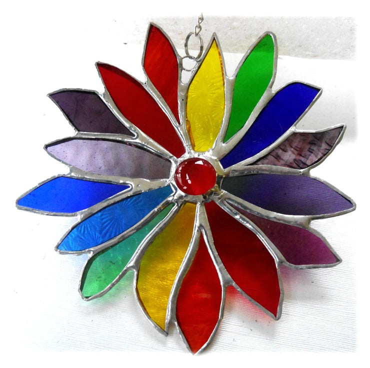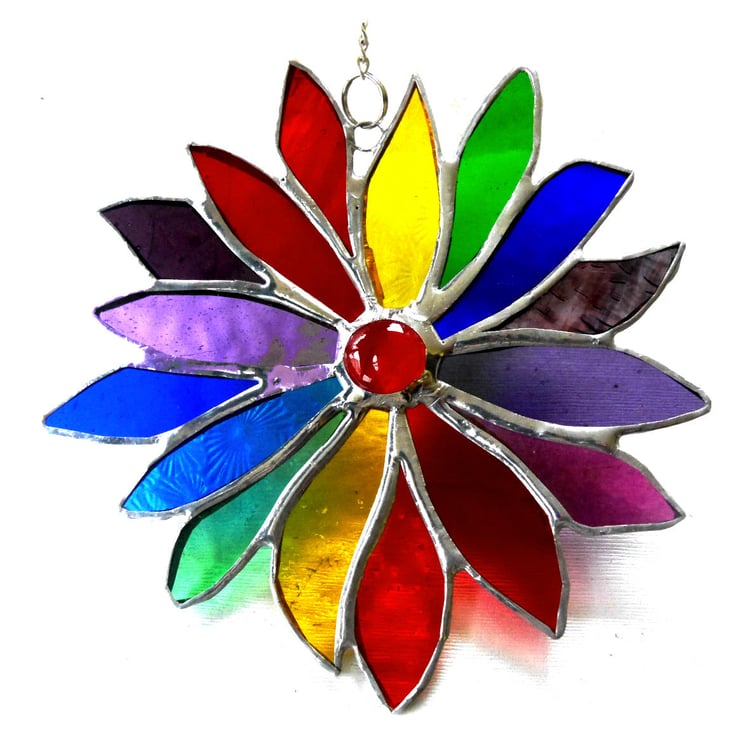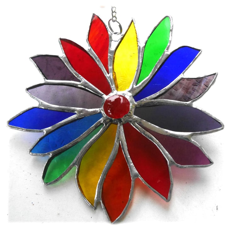 The flower has 16 petals, all slightly different shapes and the colours pass through the spectrum of the rainbow, twice. In the centre is a bright red glass nugget.