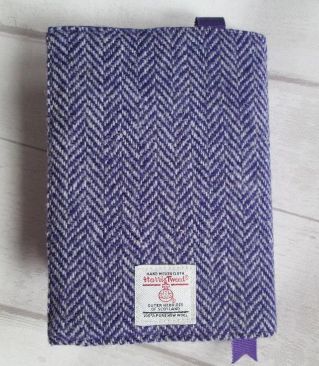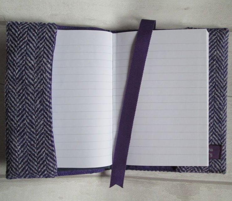 Lined with coordinating purple cotton and incorporating a handy ribbon place marker, the cover is completed with the official Harris Tweed 'Orb Mark' label on the reverse and comes complete with a hardback lined notebook.