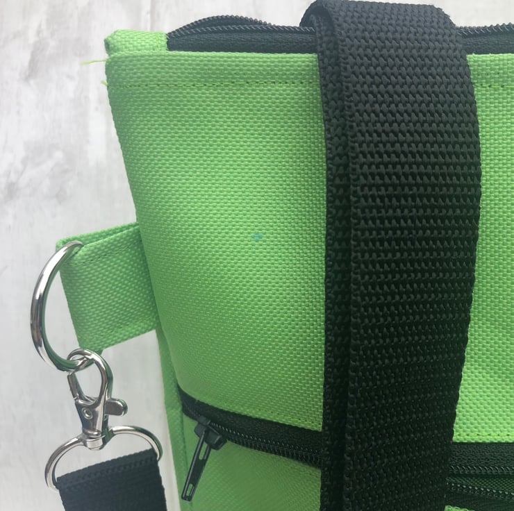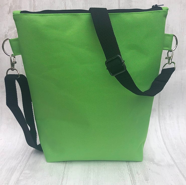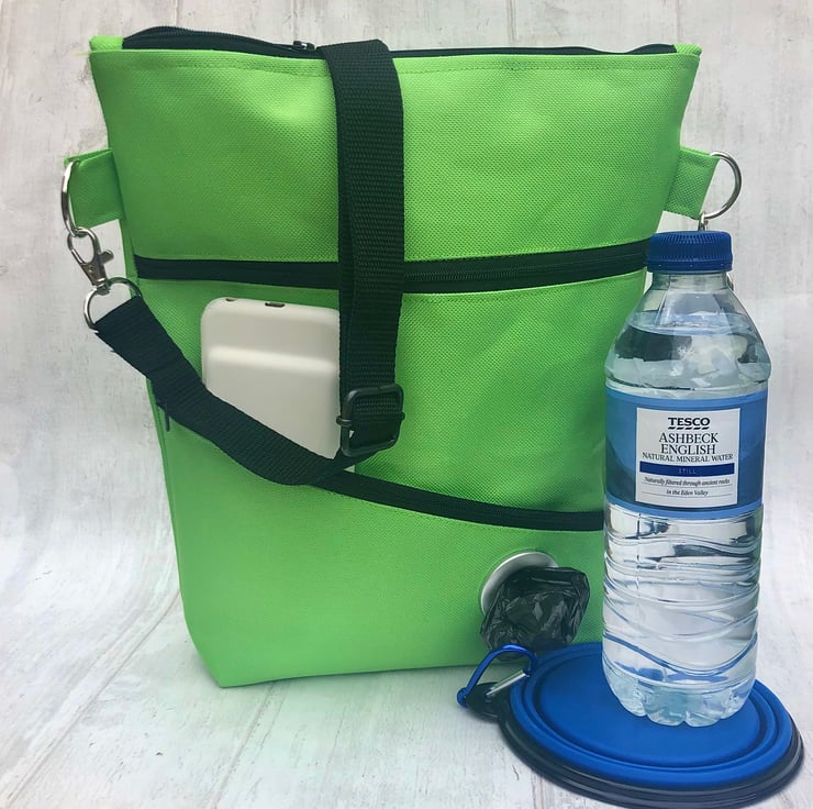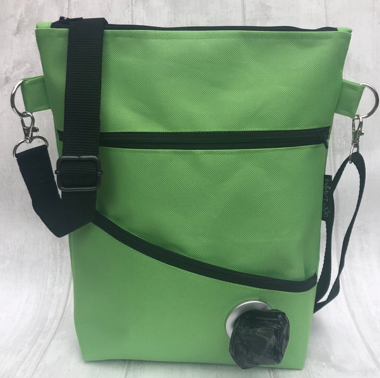 This lime green Dog walking bag is lined with a black waterproof nylon lining. This handy bag will hold all your essentials for walking your dog.