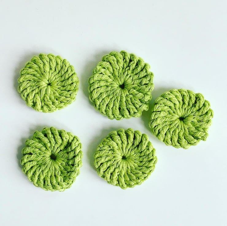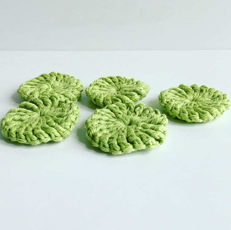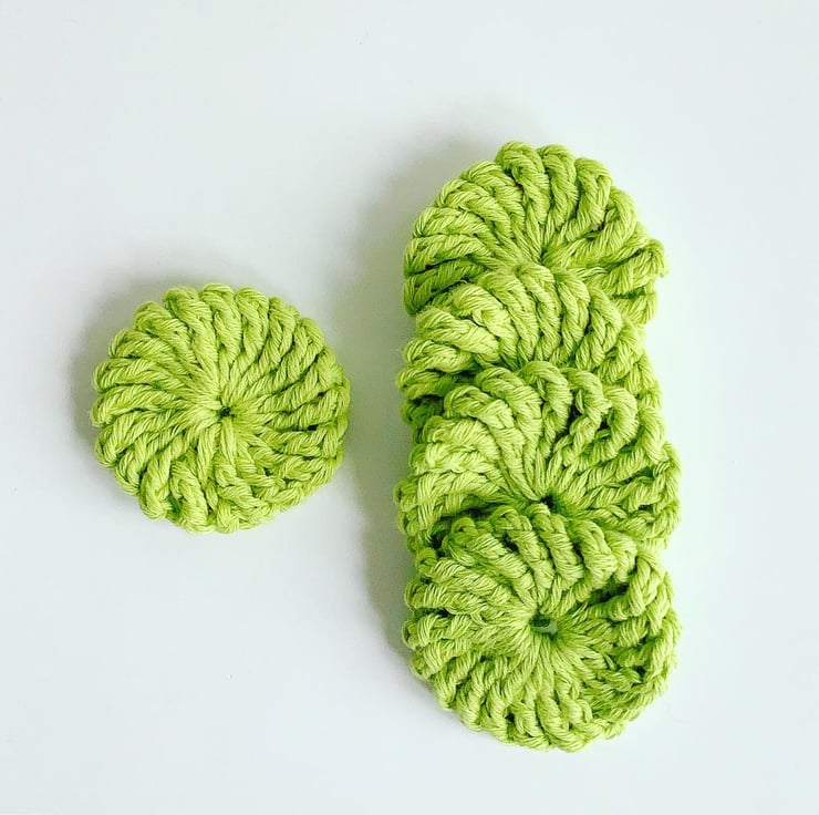 The pack contains five, lime green crochet scrubbies to remove your makeup. Also great for exfoliating or applying cream.