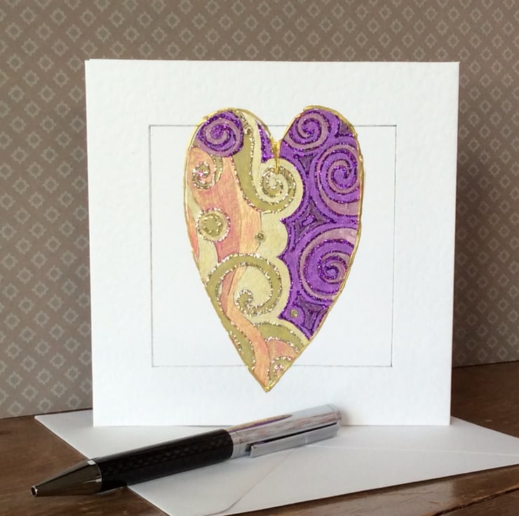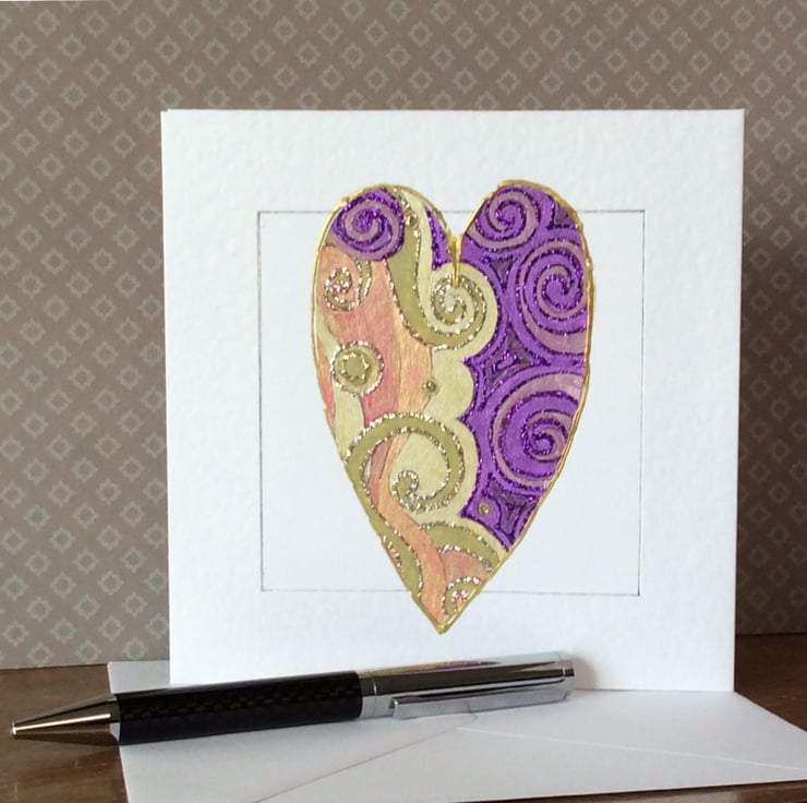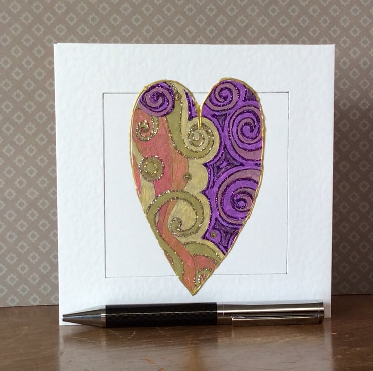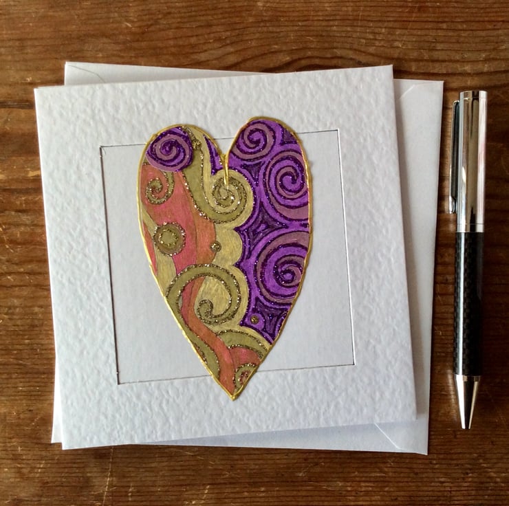 This handmade card has gold and purple spiral patterns, enhanced with glitter and with a 3-D gold frame. It’s perfect for a wedding, anniversary, engagement, Valentines or for someone very special. It is blank inside making it ideal for any occasion. This Hammer White Card measuring 14.5 x 14.5cm, comes with an envelop in a plastic cover for protection.