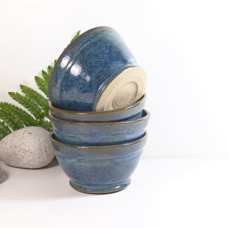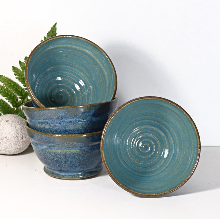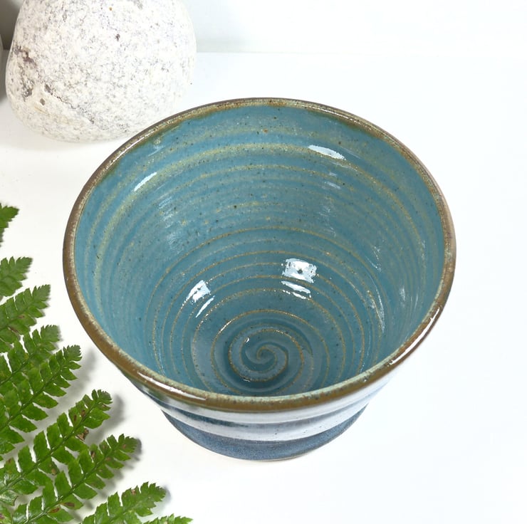 The clay these bowls were made from was dug up from our own island. The spiral shows the energy of our lives and the ancient physics of the potters wheel. The glazes reflect the colours that we see in our surrounding lowland pastures and mountains as the seasons change.
