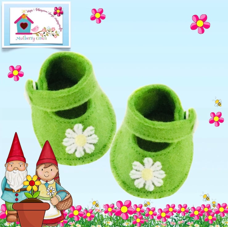 A cute little pair of green shoes, decorated with little daisies to fit the Mulberry Green characters. The shoes are hand stitched using double layers of felt and fasten with a popper underneath a little white button.