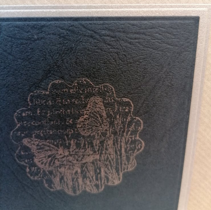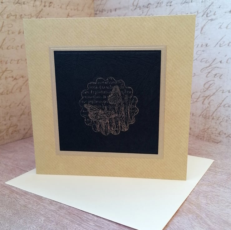 This any occasion card features an antique gold heat embossed butterfly design.on a textured black background.