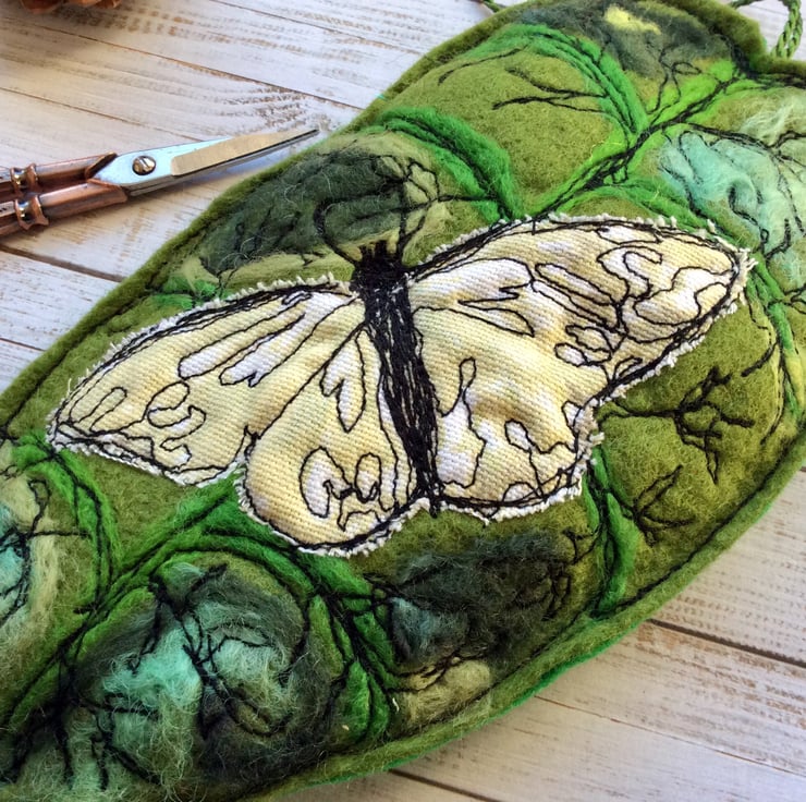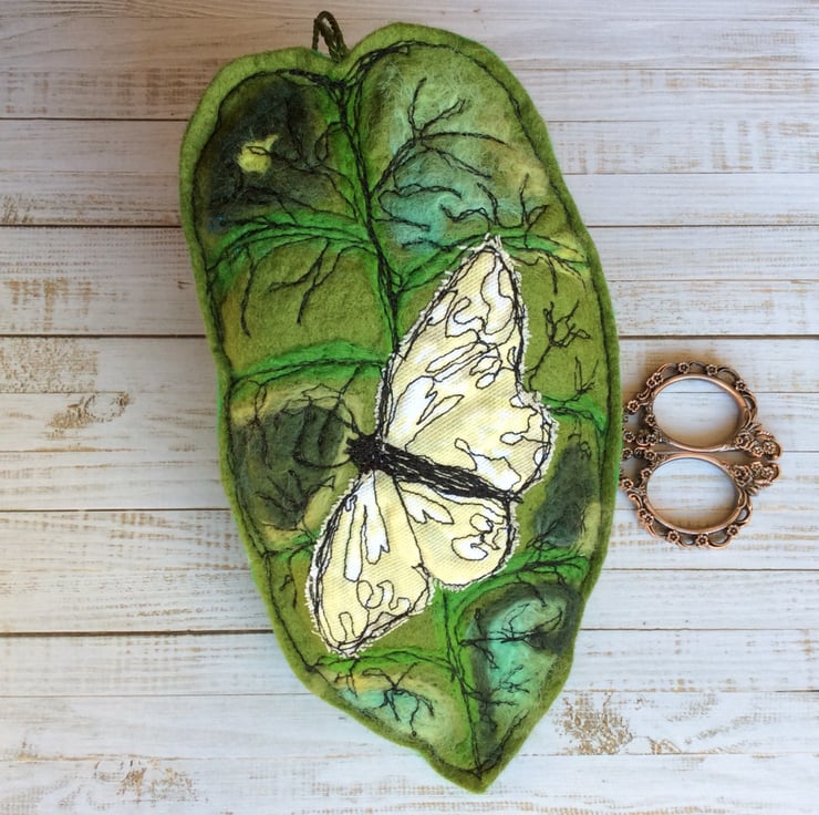 This 3 dimensional handmade original needle felted leaf decoration has been enhanced with a butterfly, coloured wools and free motion embroidery. It’s stuffed, felt backed and comes with a matching cord. It measures 19.5cm x 10cm approx. With the cord the length is 29cm.