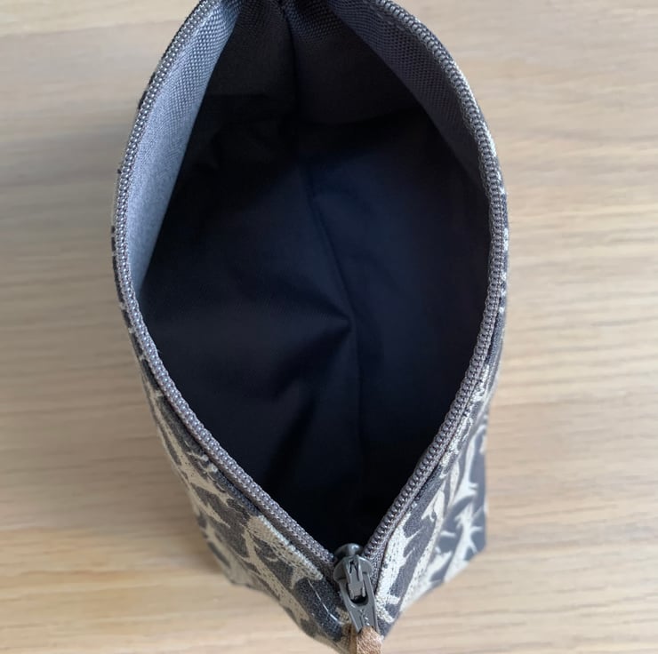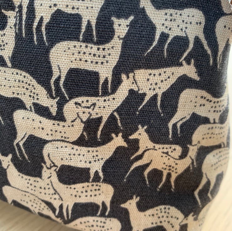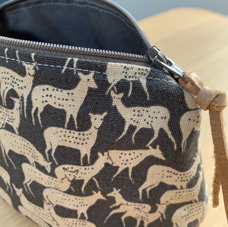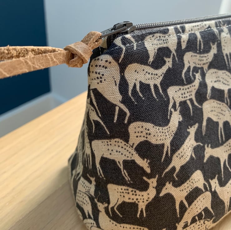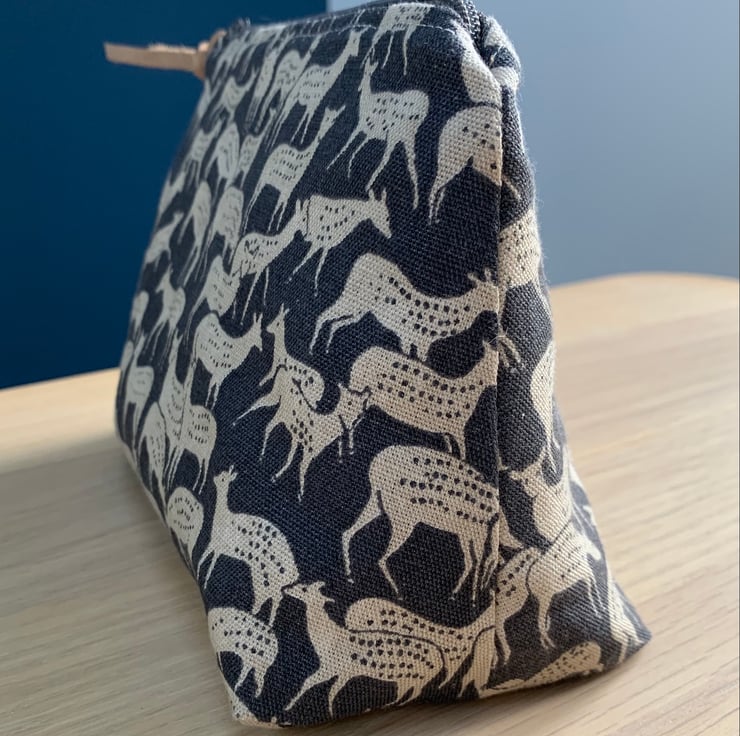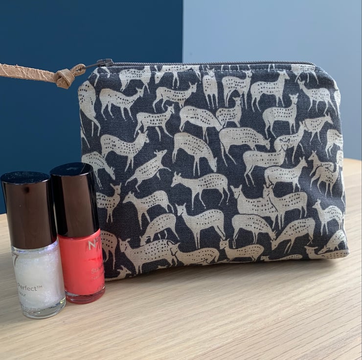 Cute cosmetic bag in Schumacher Fauna linen-mix fabric with deer gently grazing on a charcoal grey background. The bag is fully lined in waterproof fabric and has a wide flat bottom. I’ve added a leather zip pull to the YKK zip.