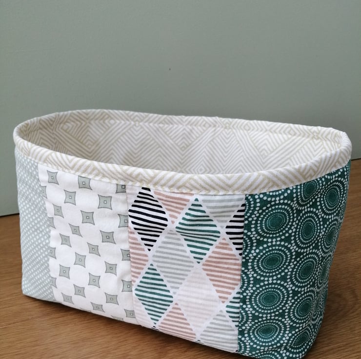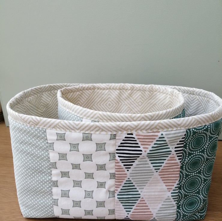 2 matching fabric baskets using 4 panels of co-ordinating designs. The lining is also a co-ordinating fabric