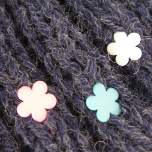 Keep your or your childrens* legs warm with these cool legwarmers. Each legwarmer has 3 flower studs attached (white pink and baby blue)