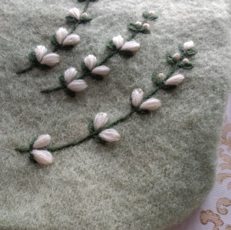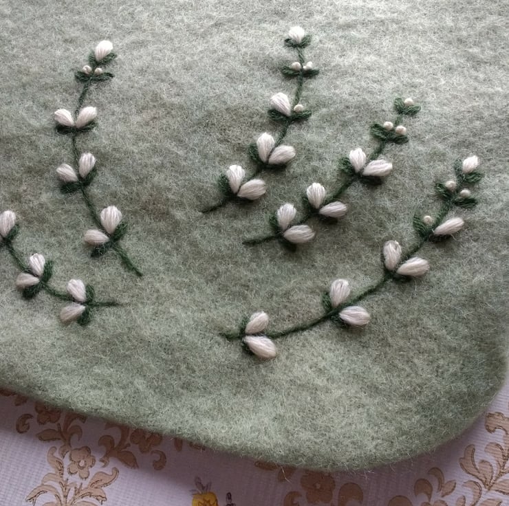 The snowberry botanical embroidery along the bottom of the cosy is hand stitched using vintage tapestry wool.