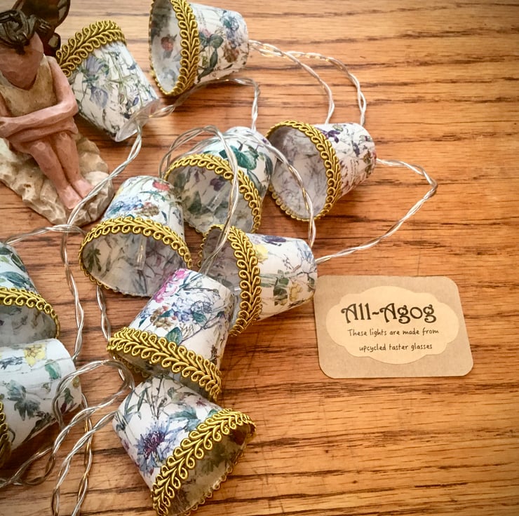 There are ten mini lampshades in each set on a battery-operated string of warm white fairy lights. The length overall length is 1.8 metres, and the length from first mini lampshade to last is 1.2 metres.