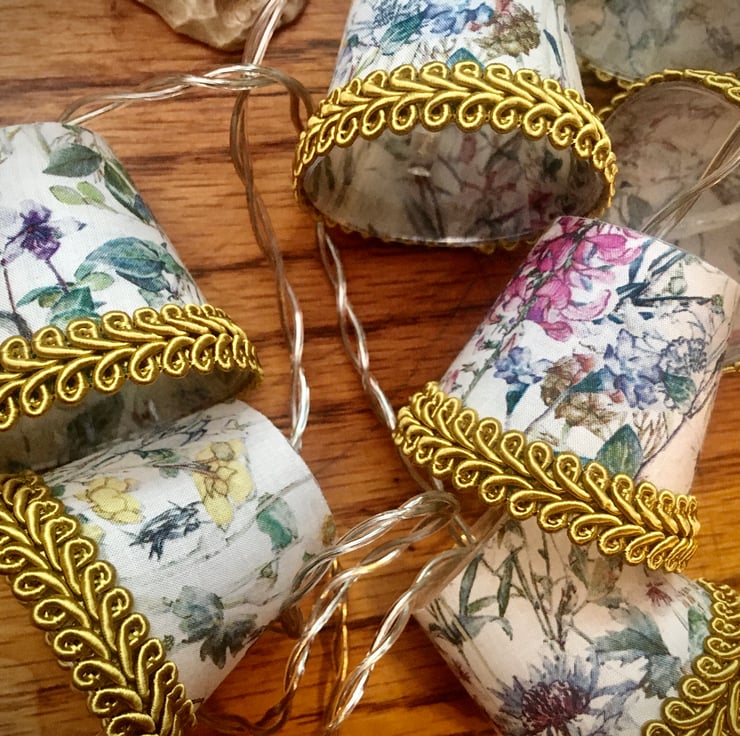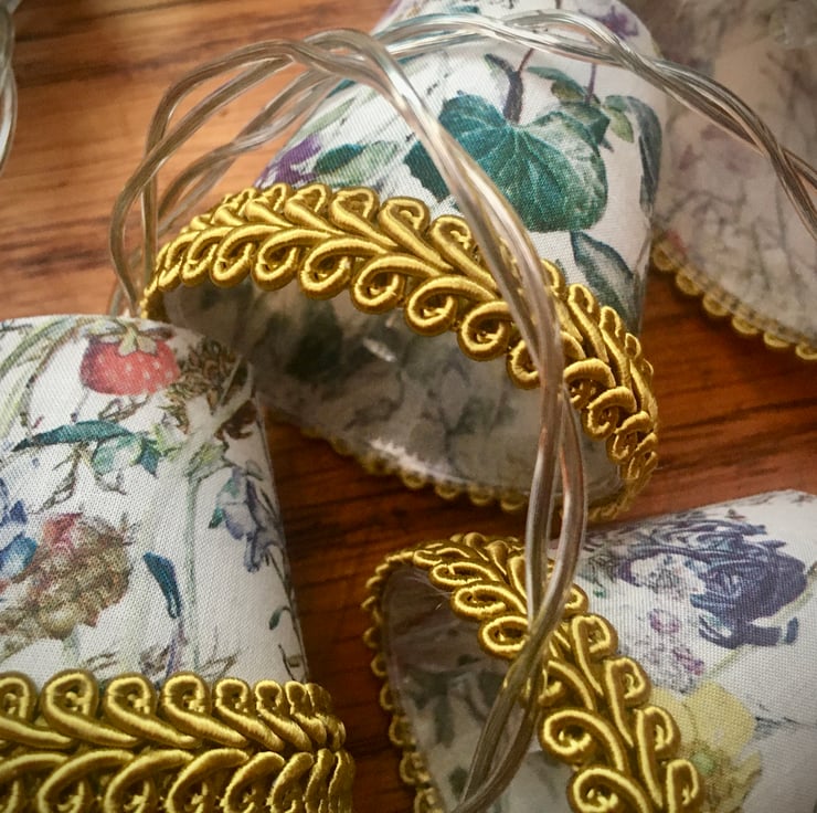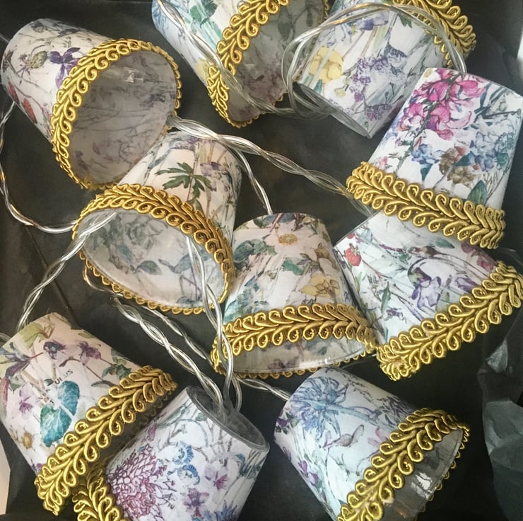 These mini lampshades are perfect to drape along a mantlepiece or shelf, around the head of a bed, or strung across a mirror or picture frame.