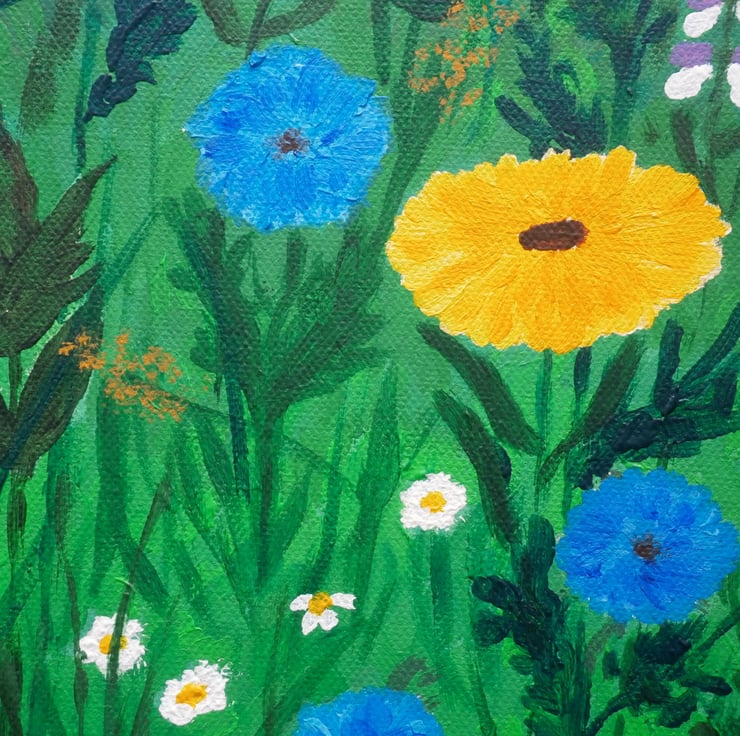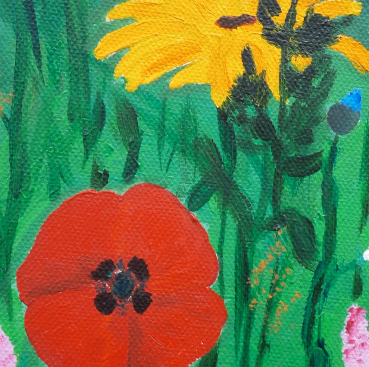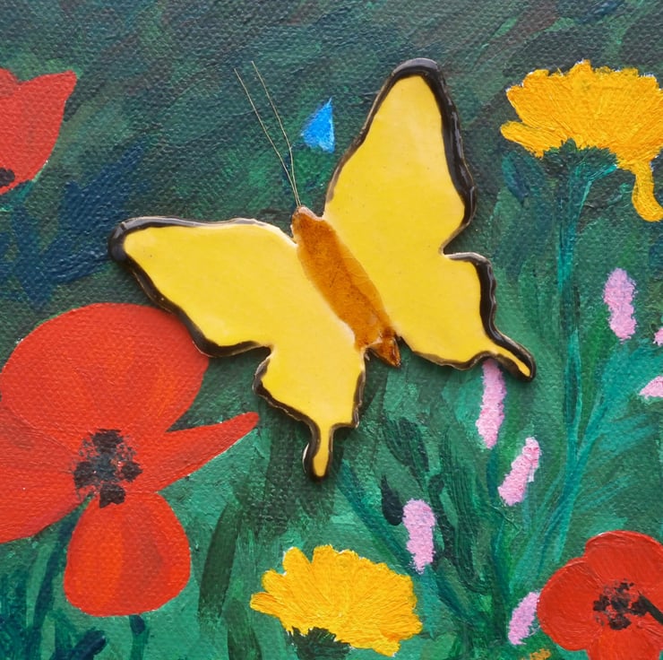 A vibrant painting of wild flowers with a definite summery feel. Red poppies, daisies, cornflowers etc. with a yellow ceramic butterfly. On unframed canvas. Canvas edges also painted, continuing the flowers and grasses.