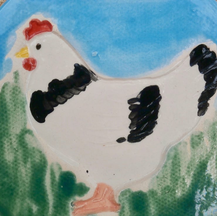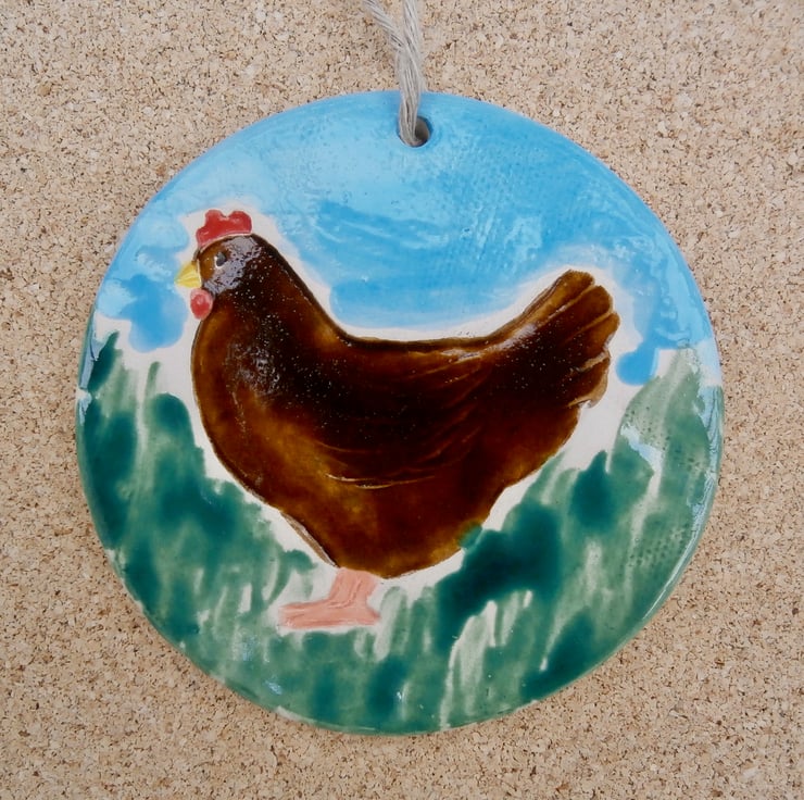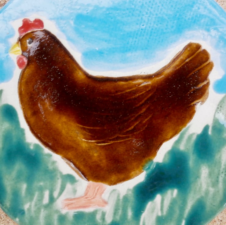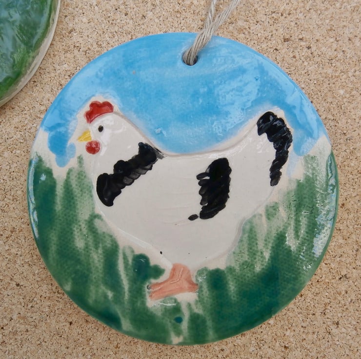 I rolled a slab of clay, cut up a circle and stamped the hen with a handmade clay stamp. After bisque firing at 1040C I applied a selection of glazes and underglazes, then put the ornament back in the kiln at 1040C.