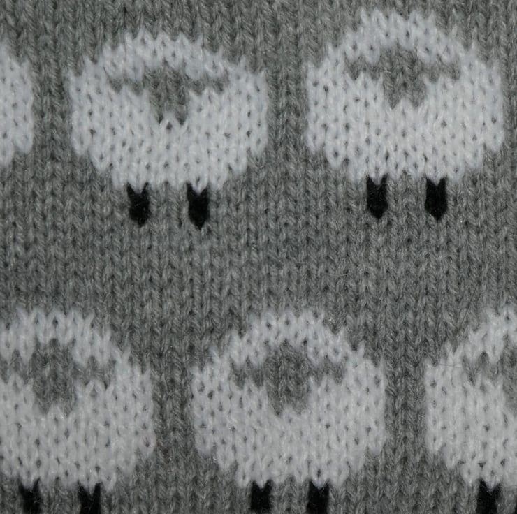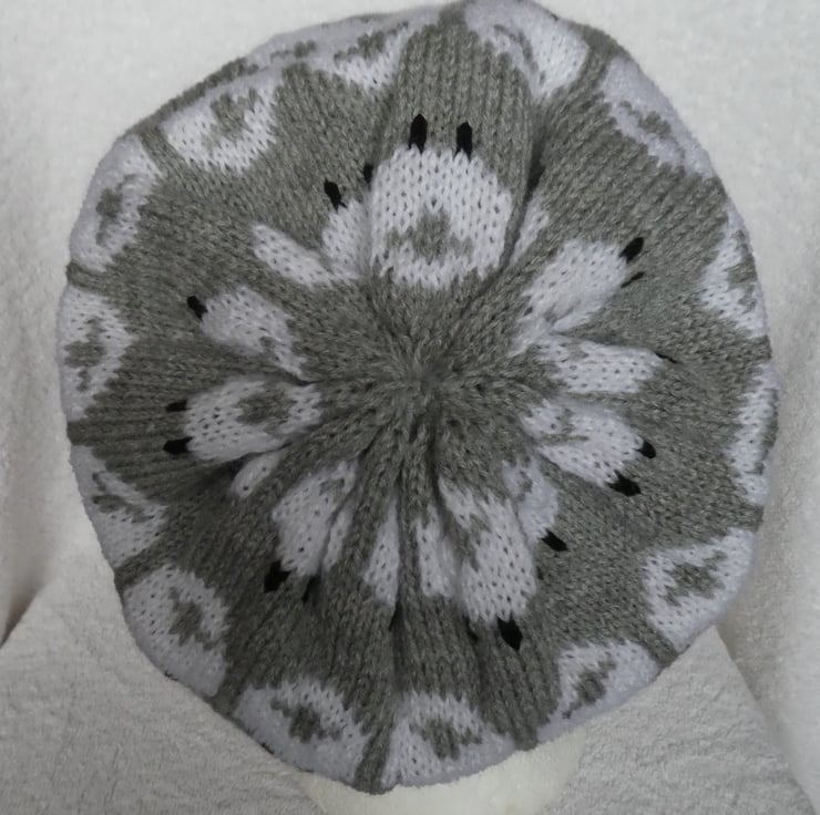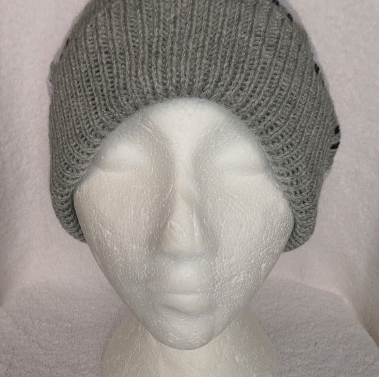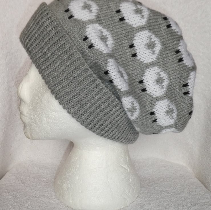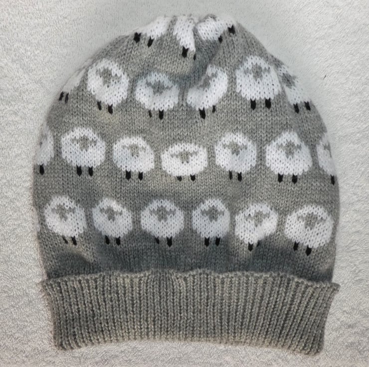 I have created this lovely warm hat on a knitting machine. There is a deep 1x1 rib, and a fair isle sheep design. The background is a mid grey yarn, and the sheep are white with black legs. This hat has been knitted flat, and finished by hand sewing the back seam and gathered at the top.