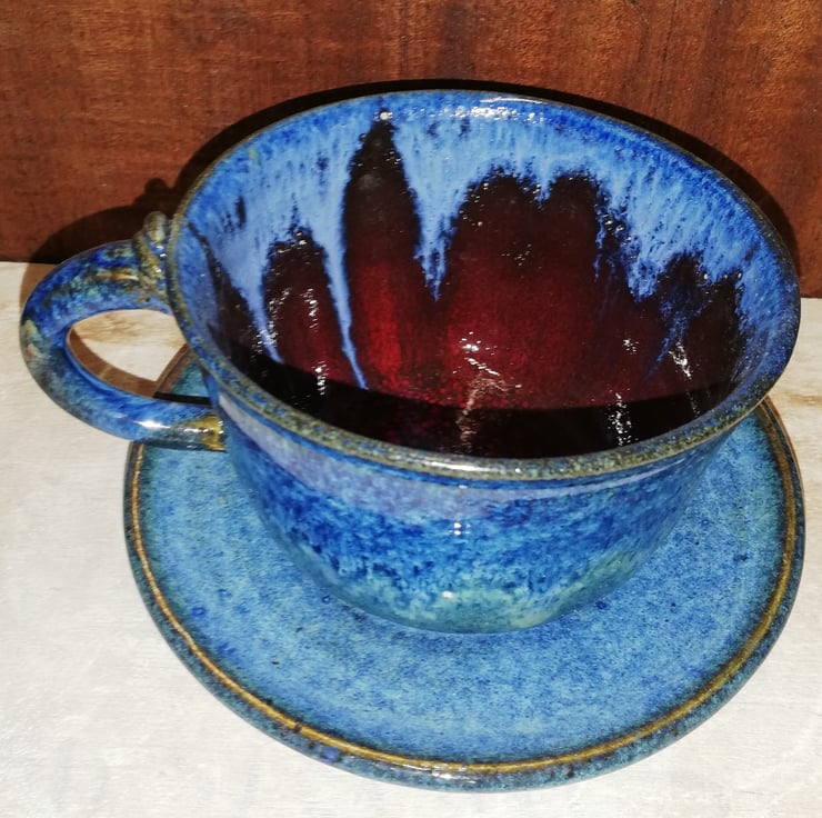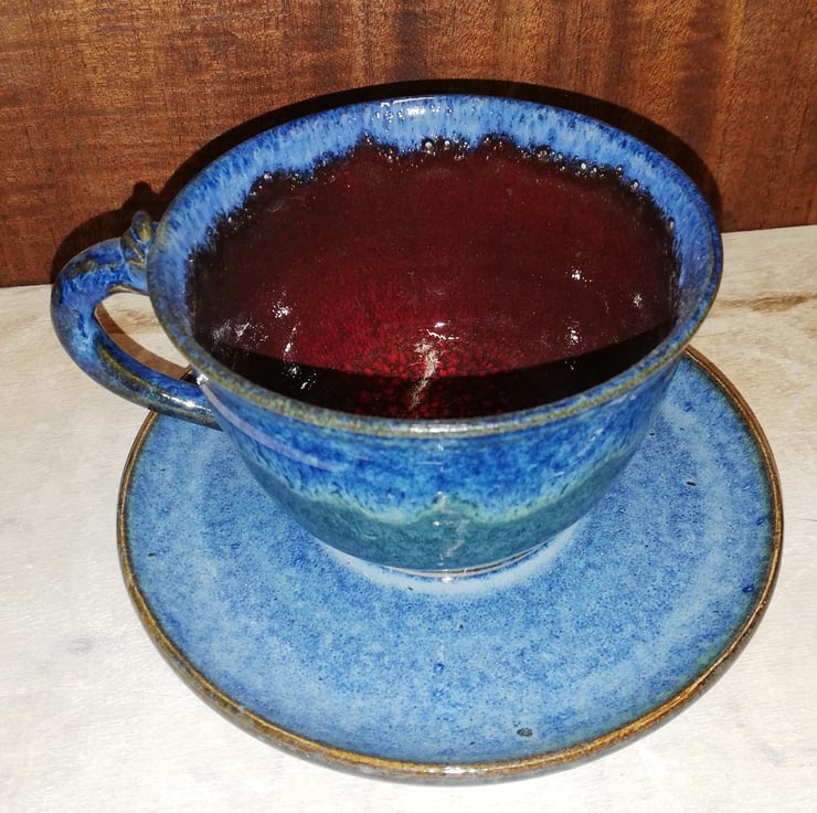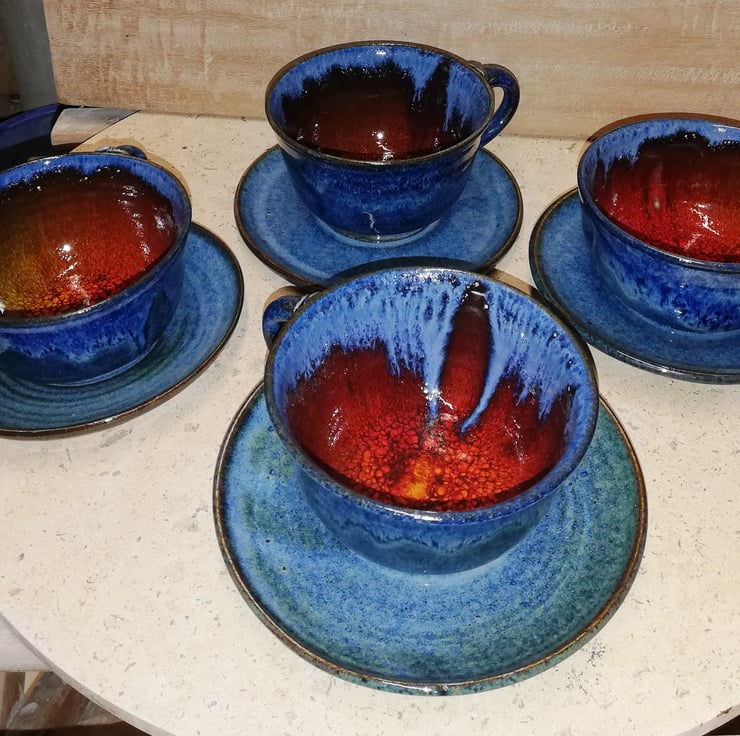 A selection of cups with saucers, delightful vibrant blue glaze out and on the main plate of the saucers.
