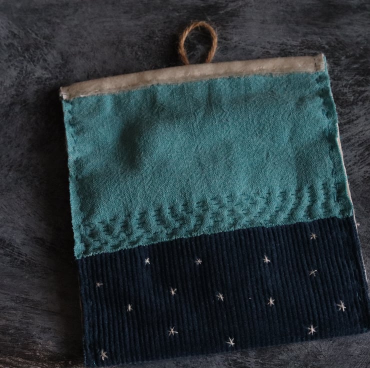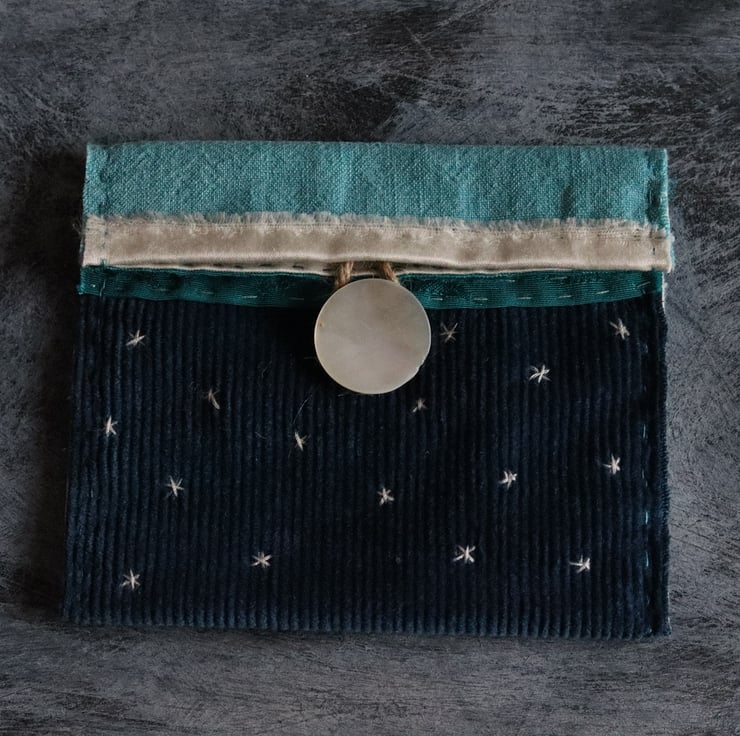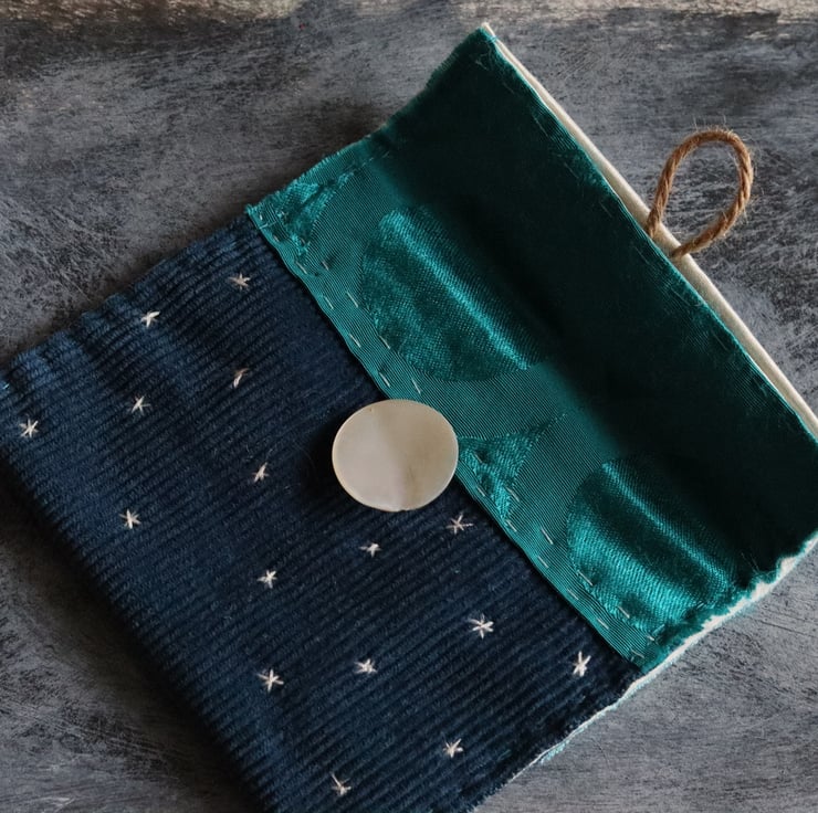 slows stitched by hand using pieces of pre-loved cloth. fastened with a moon-like shell button.