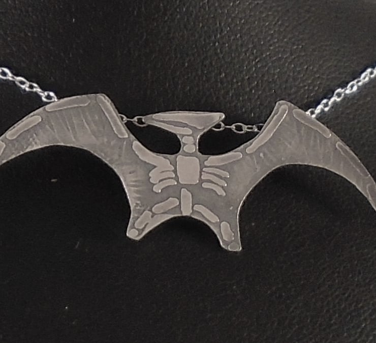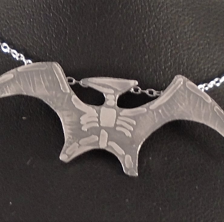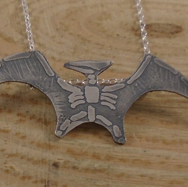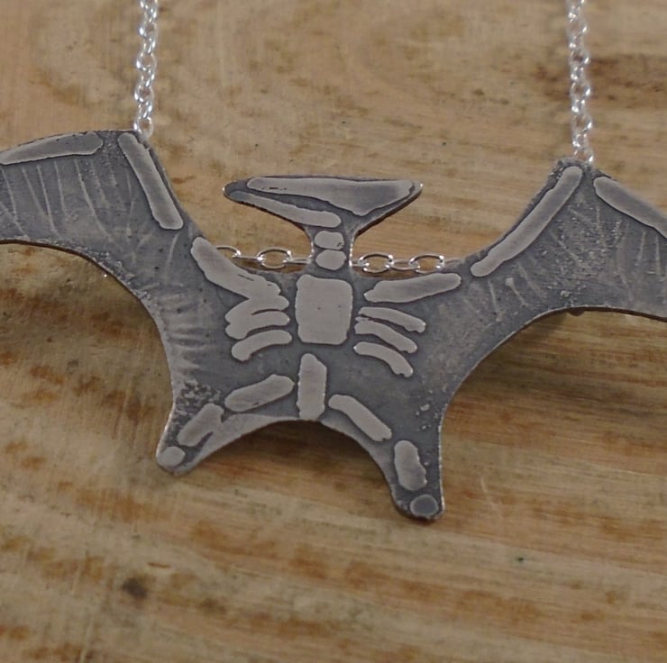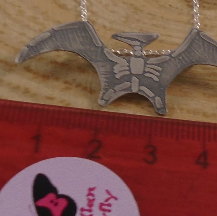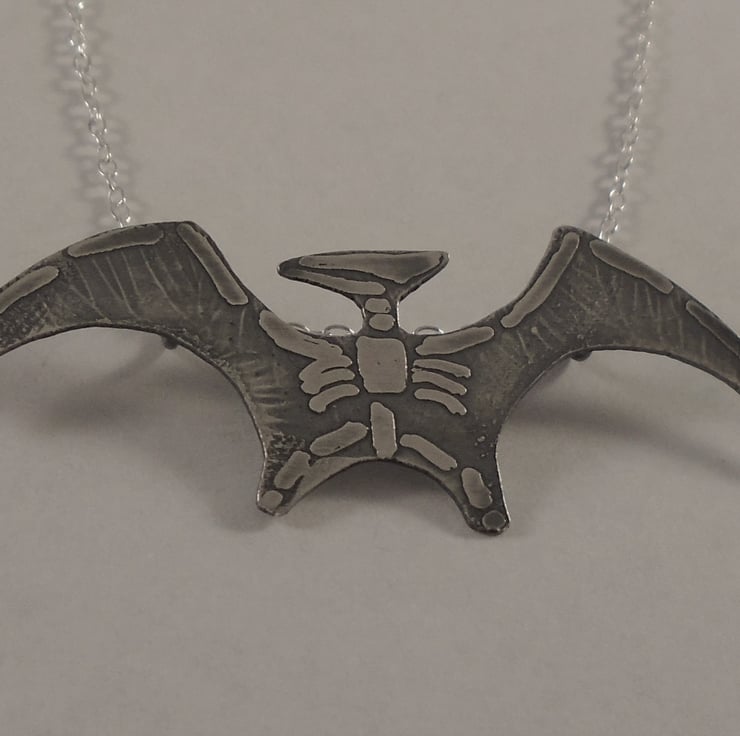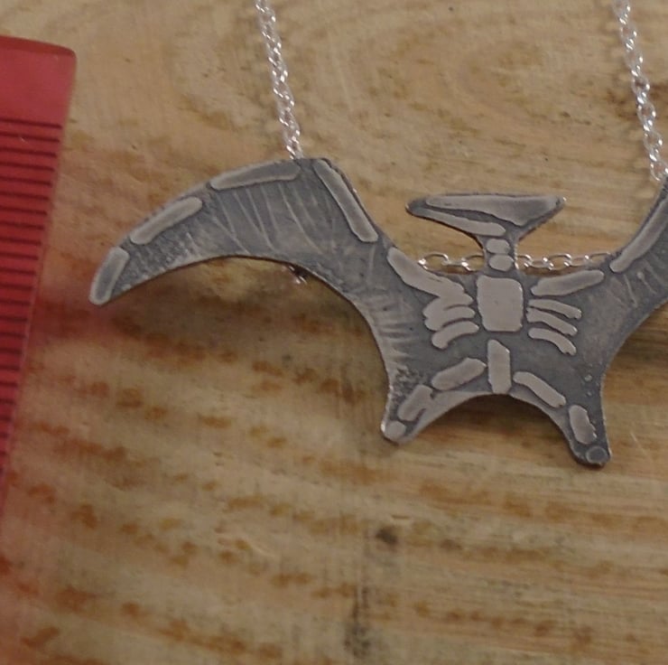 A quirky and unusual necklace, hand made from sterling silver. The shape of the Pterodactyl has been hand pierced from a sheet of sterling silver. The skeleton has then been hand drawn and etched. Two loops have then been soldered to the back for the chain, and the necklace has been oxidised to blacken the etched design.