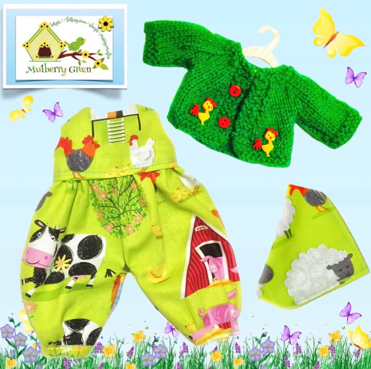 A really cute little playsuit with a matching headscarf in a lovely farmyard print to fit the Mulberry Green characters. The playsuit is made from cotton, has gathered legs and a lined bodice and comes on a cute little wooden hanger. The headscarf has an elasticated back. It matches the farmyard friends shortie cardigan.