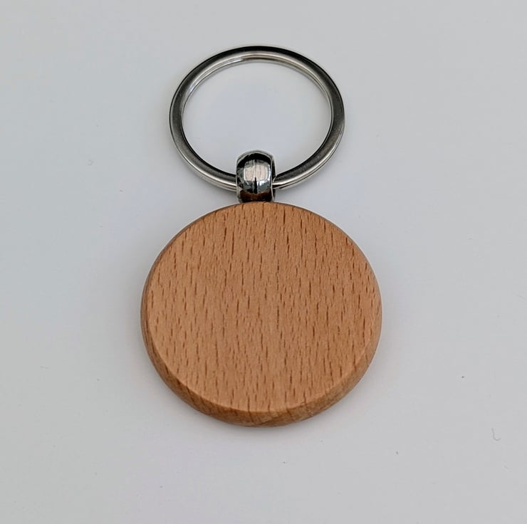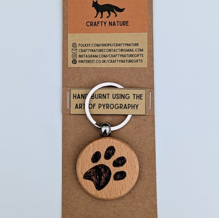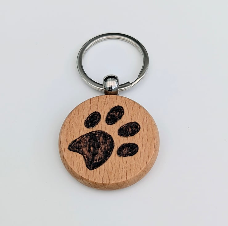 Lovely, round solid wood keyring which has been hand burnt with a paw print on the surface using the art of pyrography and varnished for protection.