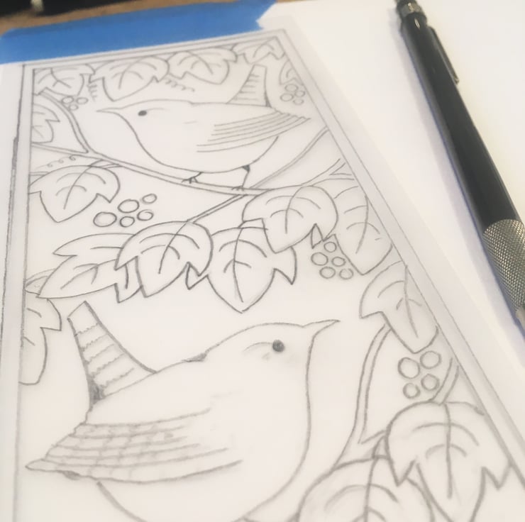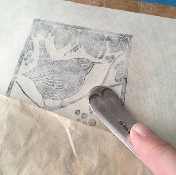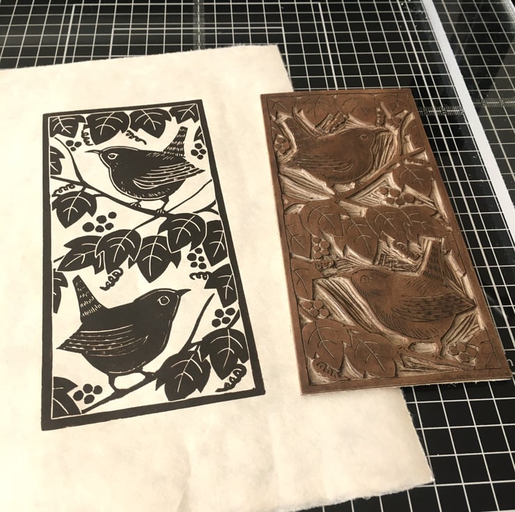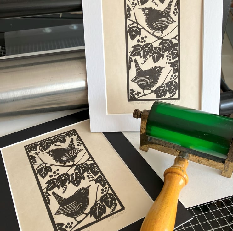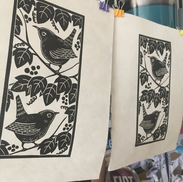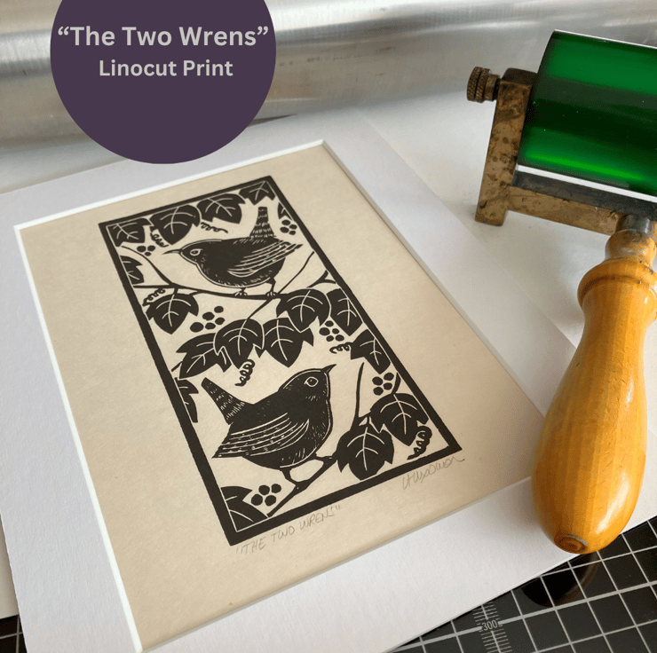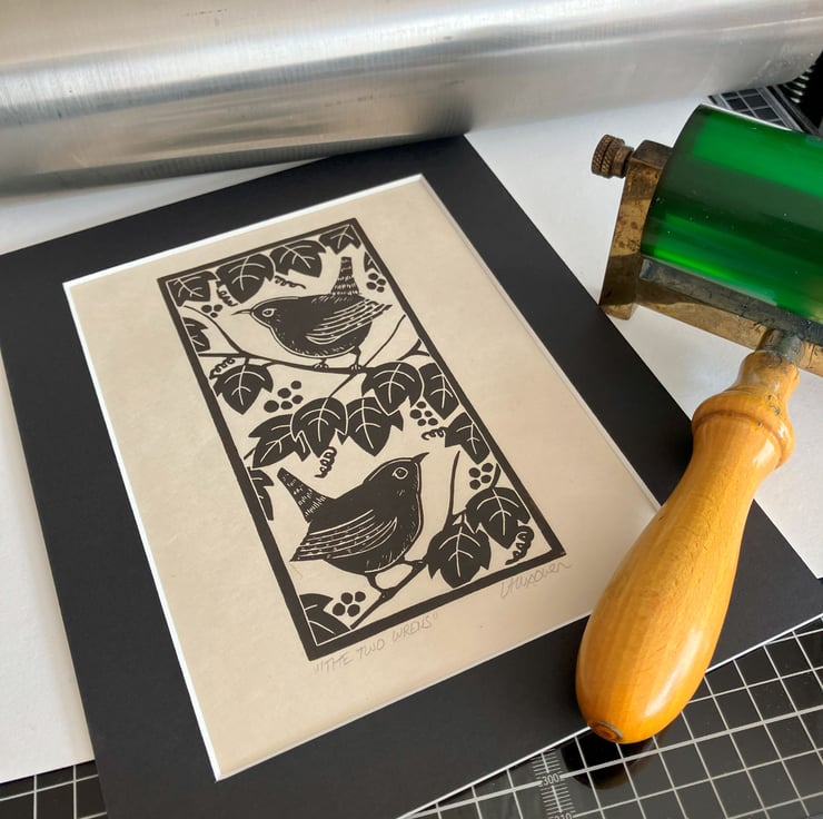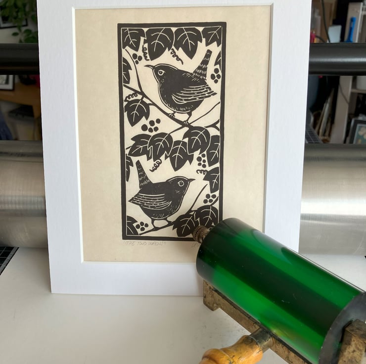 "The Two Wrens" is created using the relief printmaking method of linocut printing. As each print is created by hand there may be tiny variations which add to the individual beauty of each original artwork. "The Two Wrens" is printed onto Kitakata 36gsm printmaking paper from the Awagami factory in Japan.