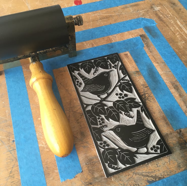 Linocut is a relief printmaking process where an image is transferred or drawn directly in reverse onto the lino block. It is then carved using mainly U and V shaped gouges into the surface of the lino. Ink is then applied to the block and paper laid onto the inked surface. The paper is then hand burnished or pressed and the print lifted from the block.