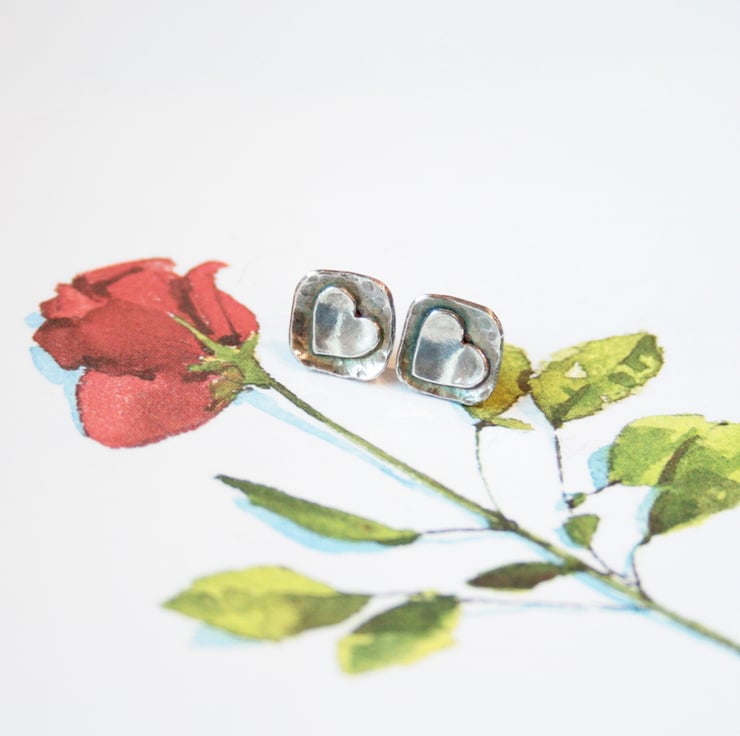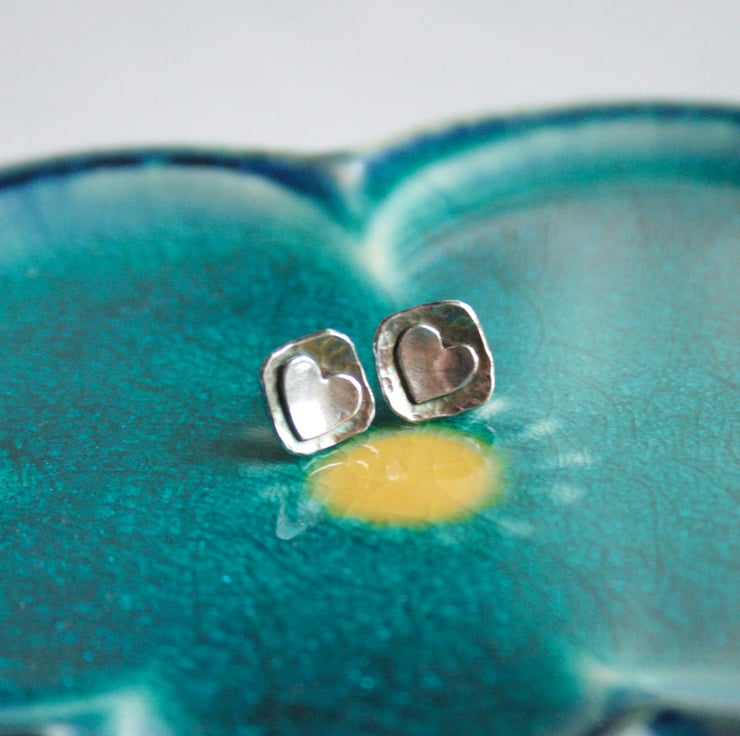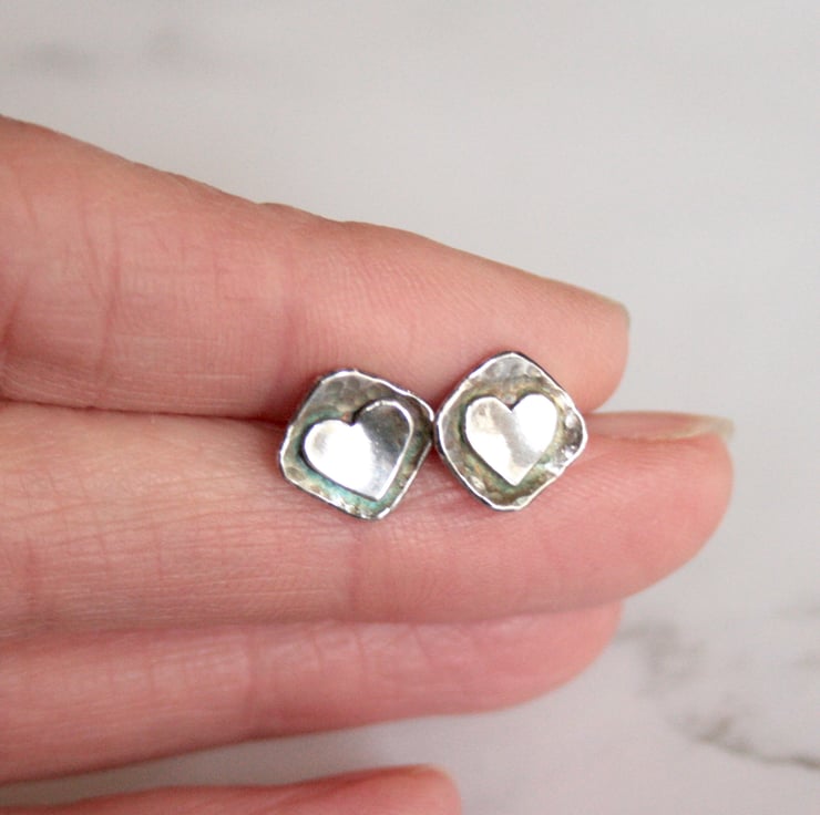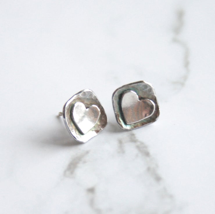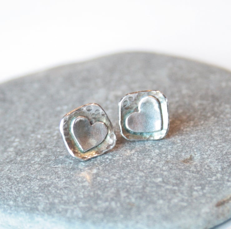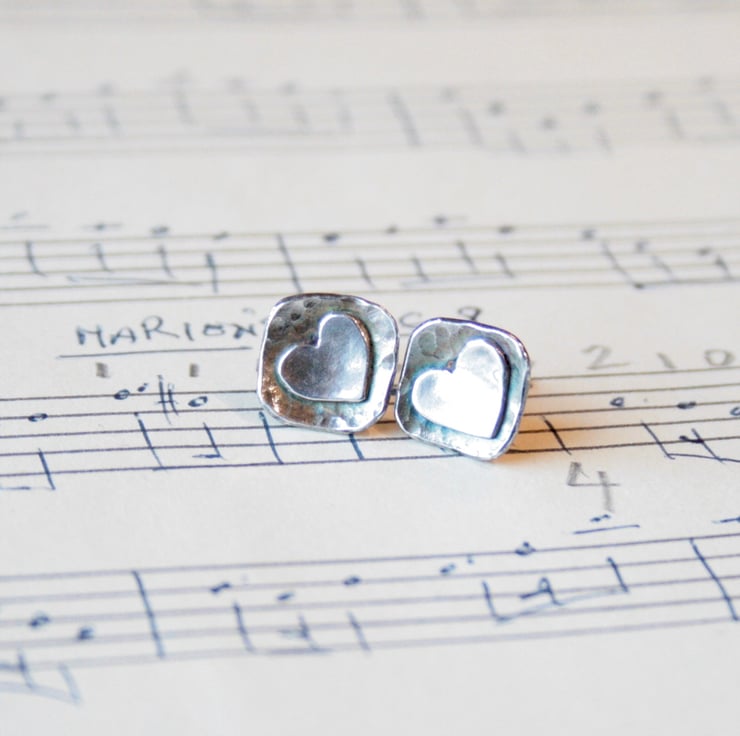 I have created them by giving the silver squares a hammered texture and soldering on a silver heart. The earring is domed and an ear post soldered to the back.