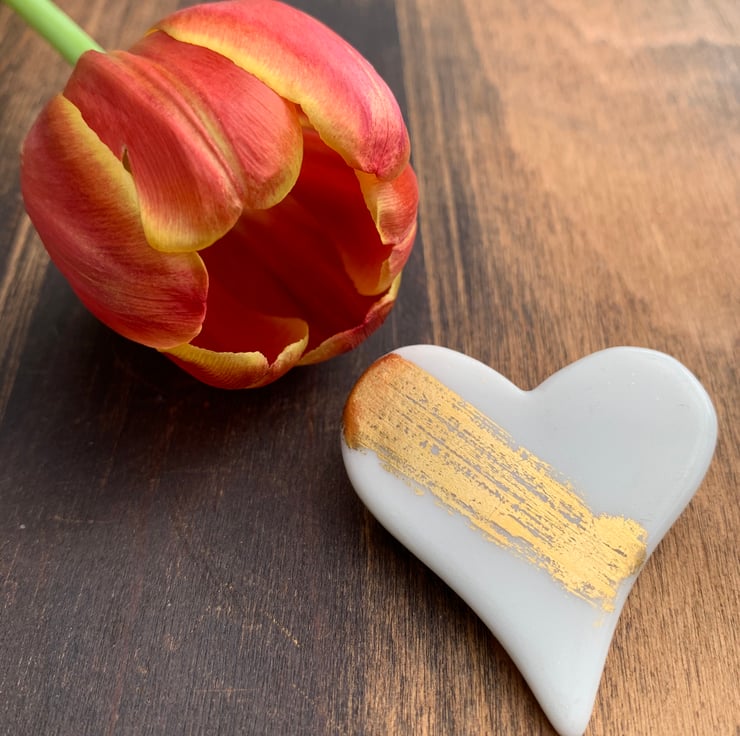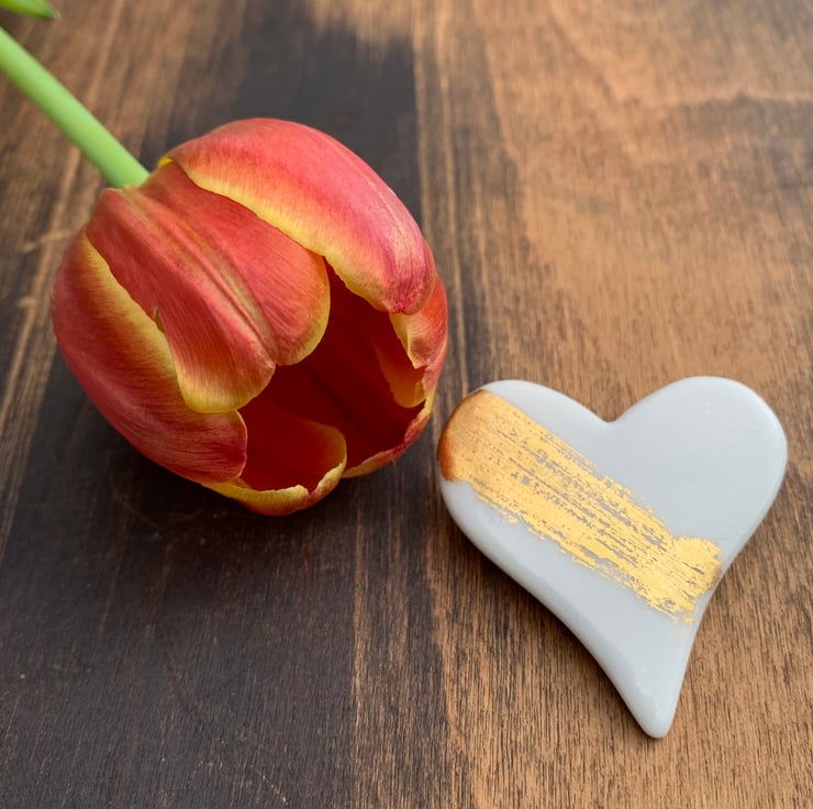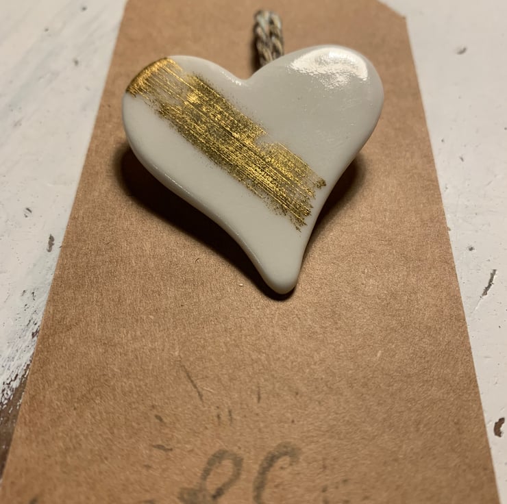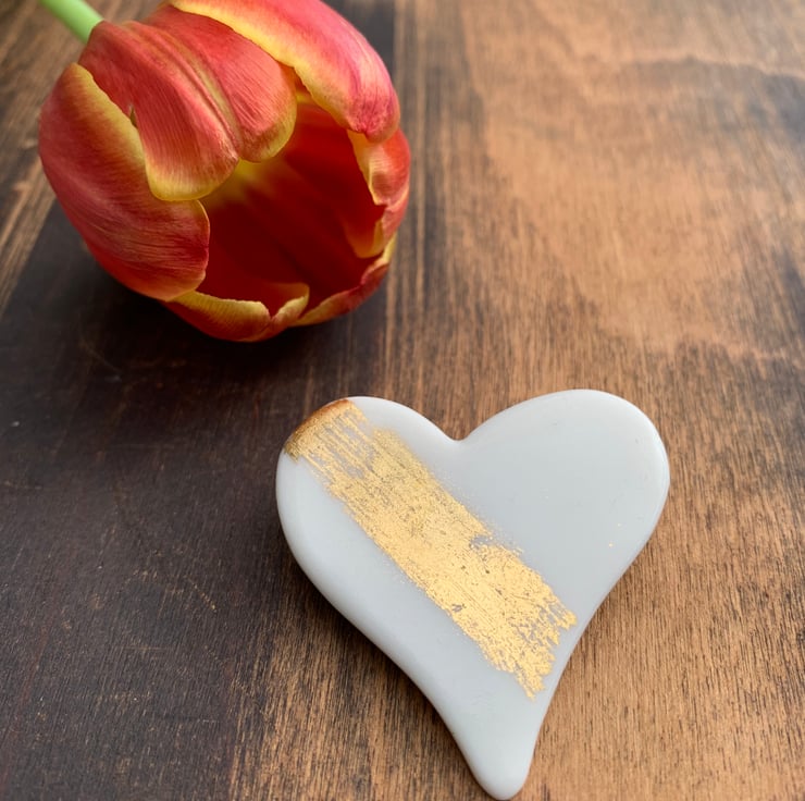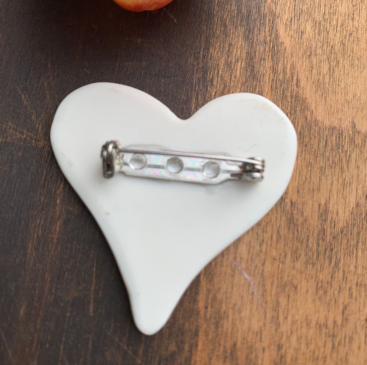 A heart shaped porcelain brooch decorated with a stripe of 23.5 carat gold leaf.