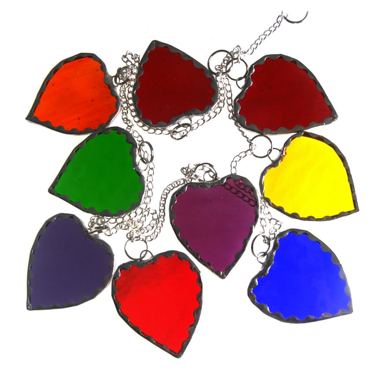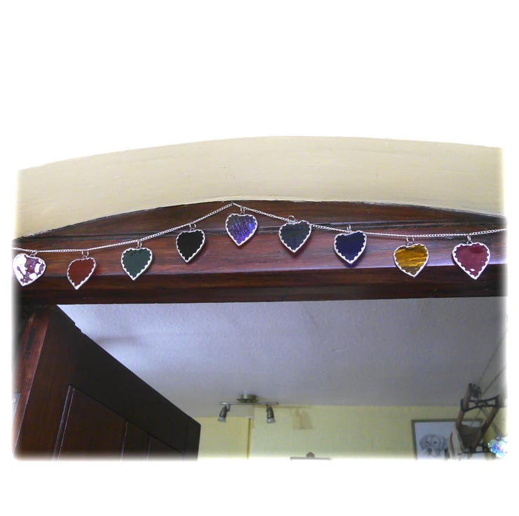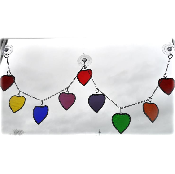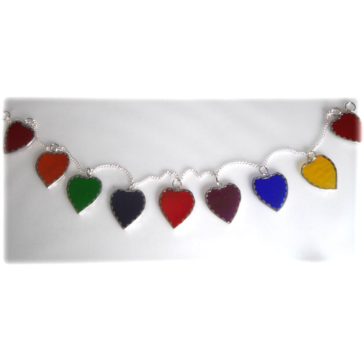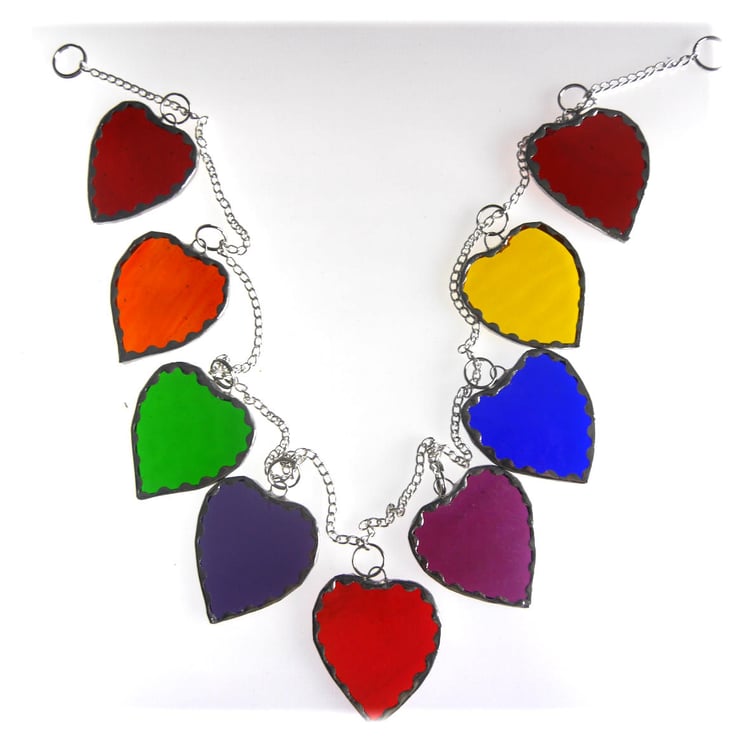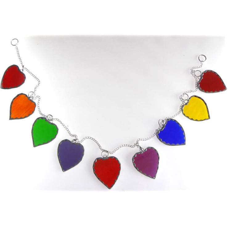 A new Joysofglass design of Glass Bunting comprising 9 Rainbow coloured Hearts.