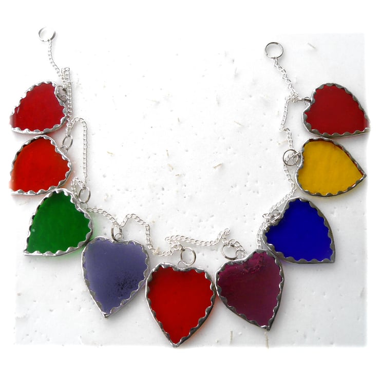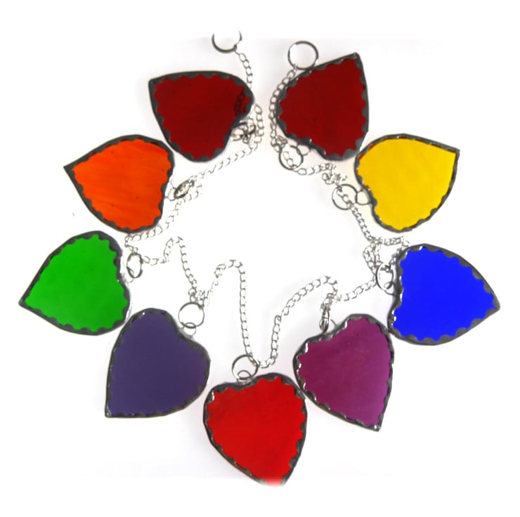 There are 9 hearts, one of each colour of the rainbow and 2 extra in red. The hearts are strung on a silver chain each hanging from the chain by a little split ring..