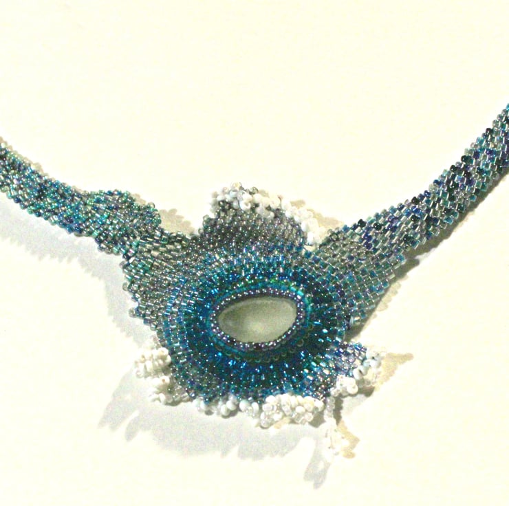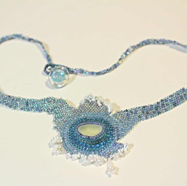 The sea glass is held in a mount created by hand stitching beads around it onto a firm backing, once the glass is properly held in place a layer of leather is fixed to the back and more beads stitched around the edge. The necklace is completed by needle weaving with tiny seed beads to create the wave like shapes. The edges are finished with white beads representing foam. The needle weaving continues to form the necklace gradually narrowing to only two beads width. A loop of beads forms half of the fastener, with a handmade bead as the other half.