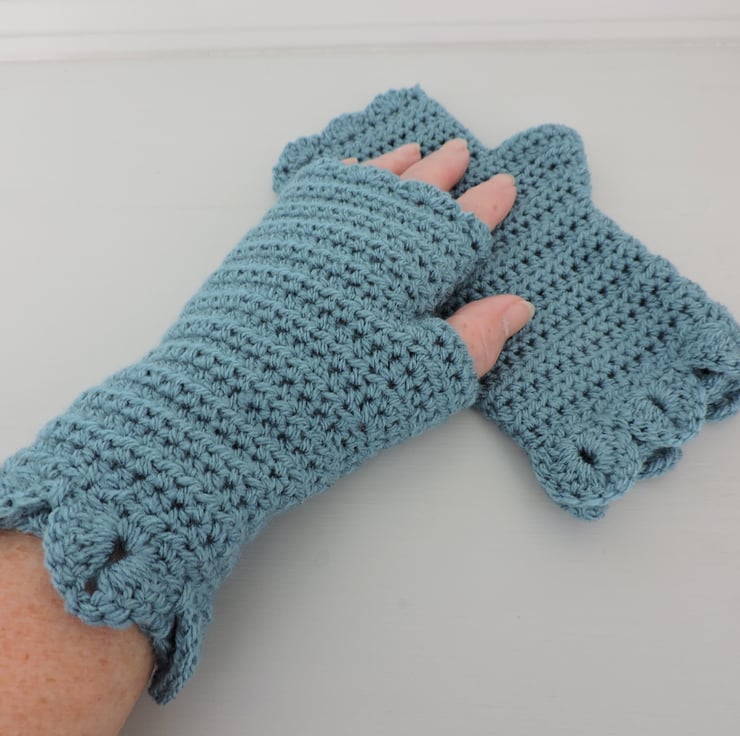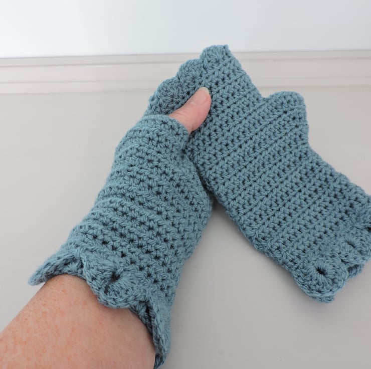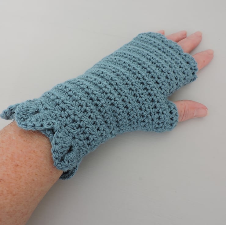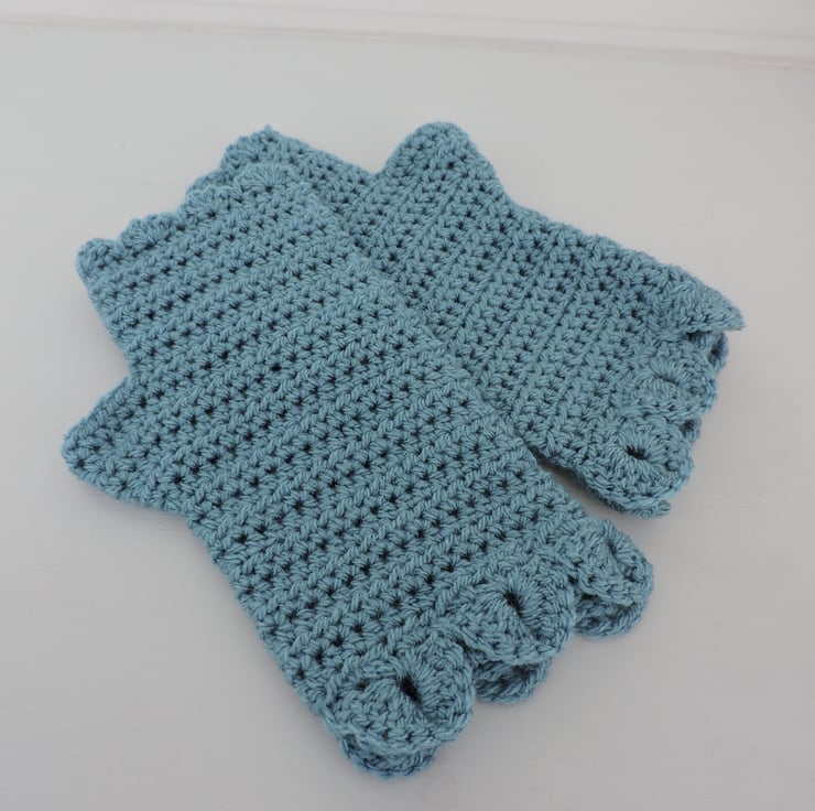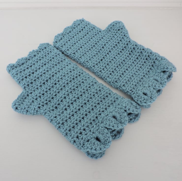 Clearance sale now £5.00 I've crocheted this pair of fingerless mitts with a 100% premium acrylic double knit yarn. A pretty duck egg blue colour. A single row of dragon scales at the cuffs, a plain body and a wavy edge to the top.. The perfect winter warmer.